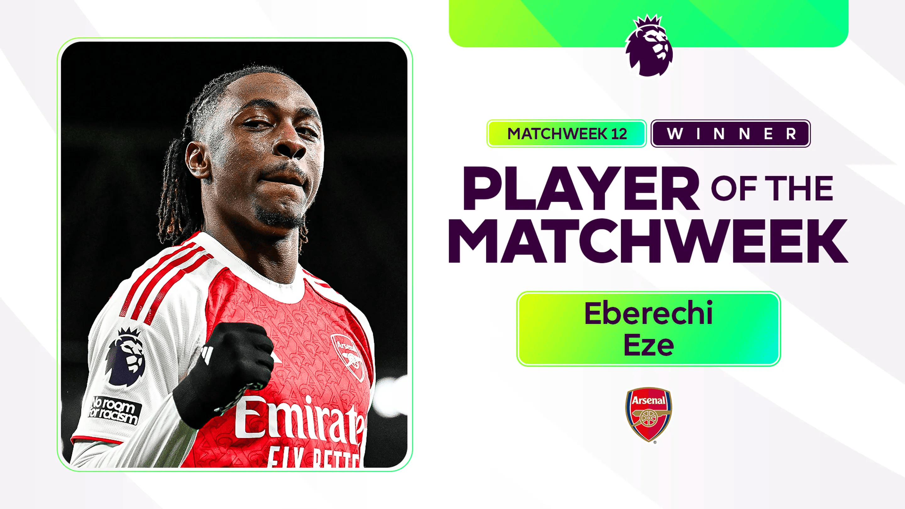 虎扑11月26日讯官方消息,阿森纳中场埃泽当选英超第12轮最佳球员。