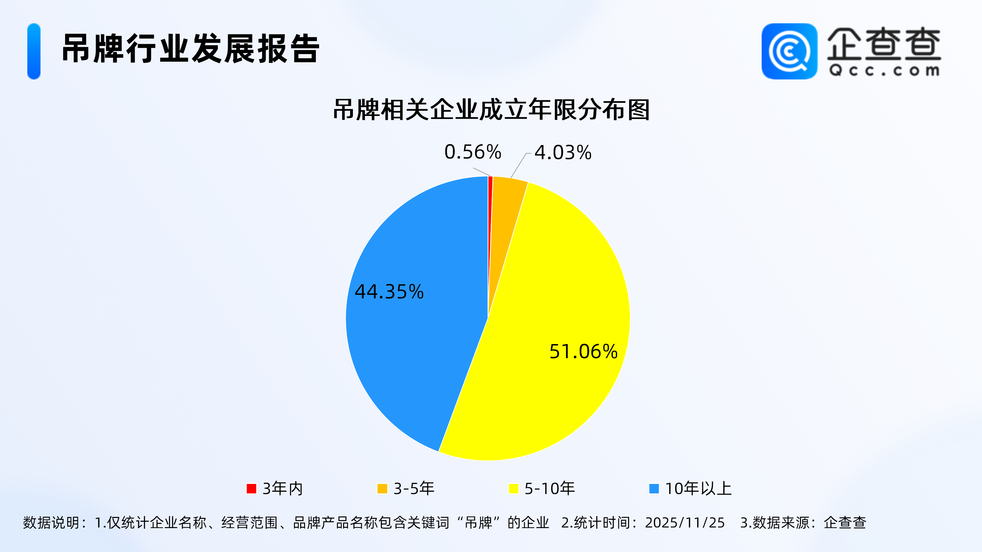 企查查数据显示,截至11月25日,国内现存吊牌相关企业4100家。从经营时间来看,吊牌相关企业多以老牌企业为主,成立年限在5-10年的相关企业占比过半,达51.06%。其次,成立年限在10年以上的相关企业占比达44.35%。