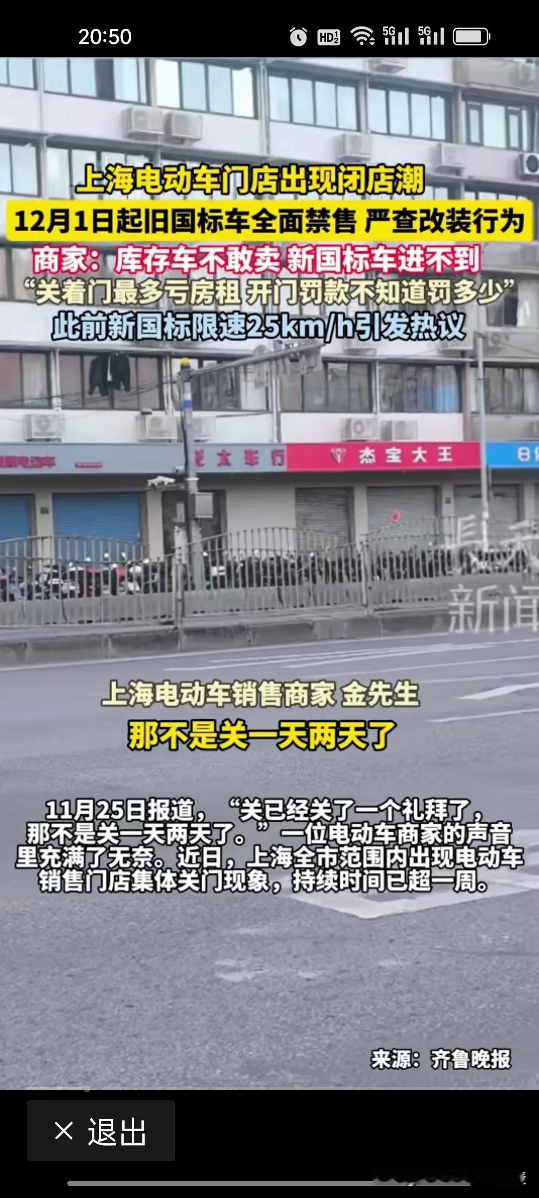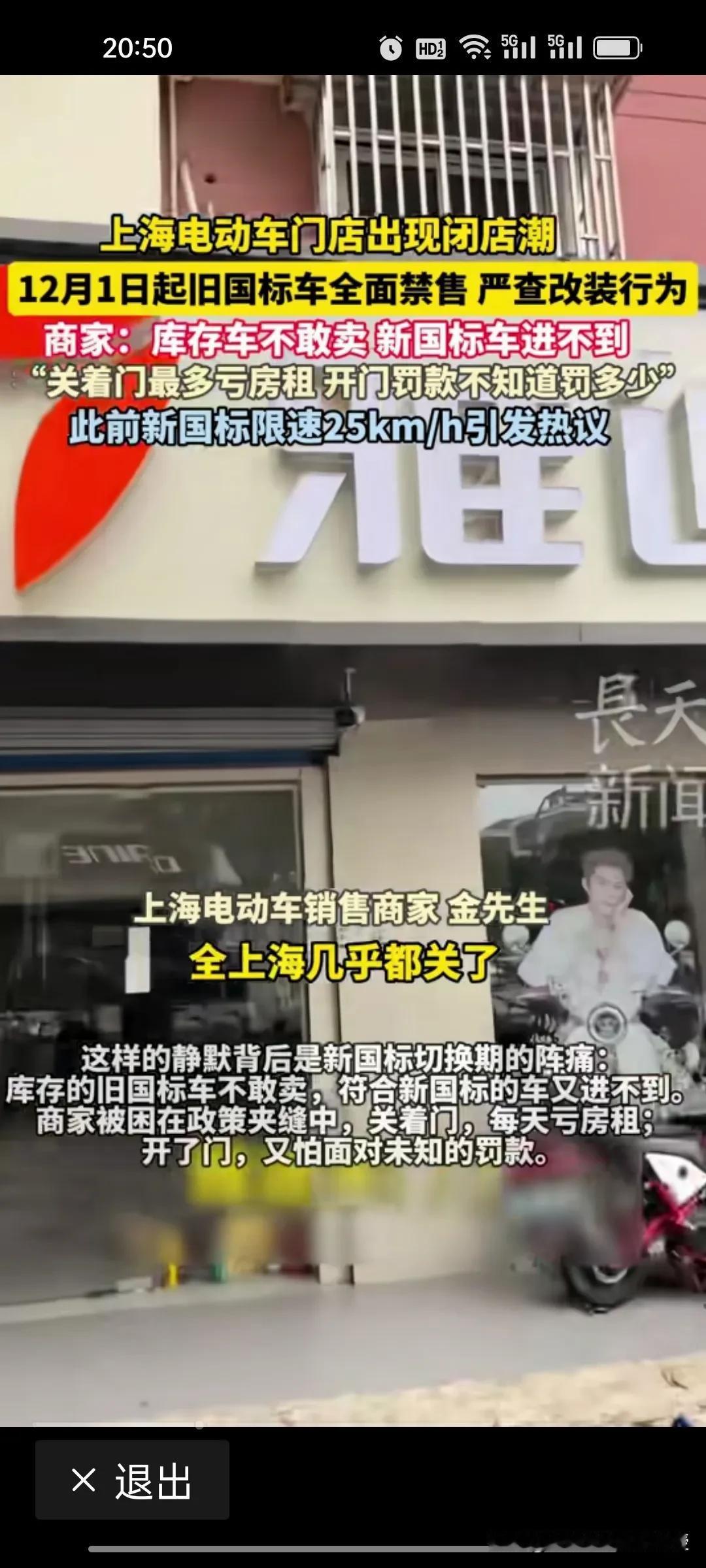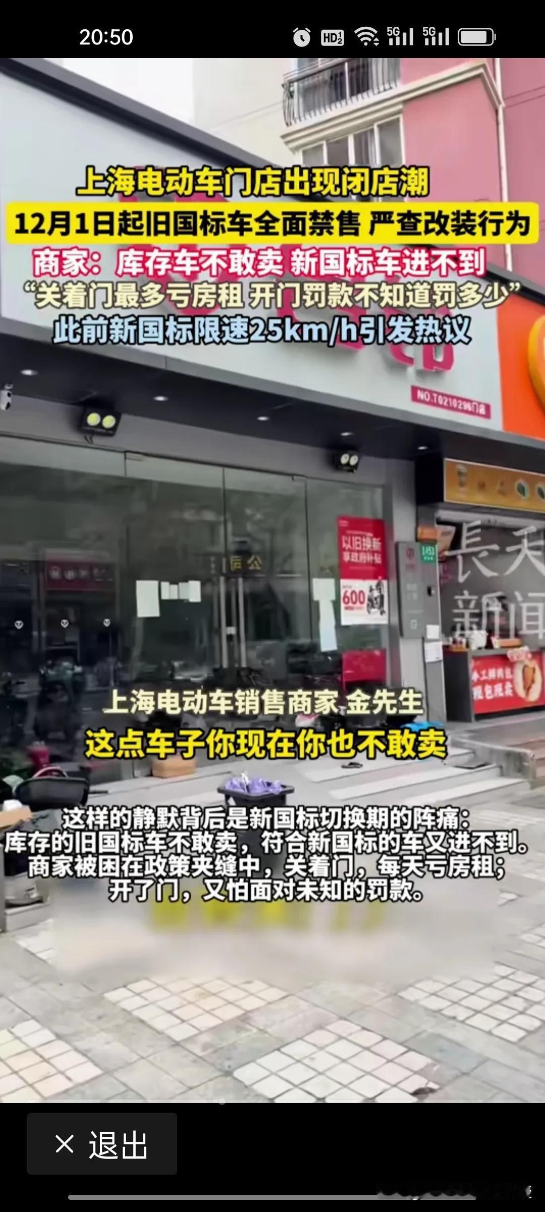 上海电动车销售商家出现闭店潮已经持续一周。一位电动车销售商金先生说,现在新国标的车进不到,旧国标的车不让卖,店开着会罚款,关店最多亏房租。从12月1日起,旧国标的车不能卖了,也不能改装。有消费者说,新国标的电动车25千米/时的速度比正常通勤时间要慢20分钟以上。 现在处在新旧转换的政策期,我认为关键点在于要拓宽电动车经销商的新货进货渠道,要是货源充足,他们还是可以赚到钱的,希望上海像这样持续一周的闭店可以尽快恢复开张。另外,新国标车的生产商也要加快力度生产,毕竟这是日常通勤的刚需。