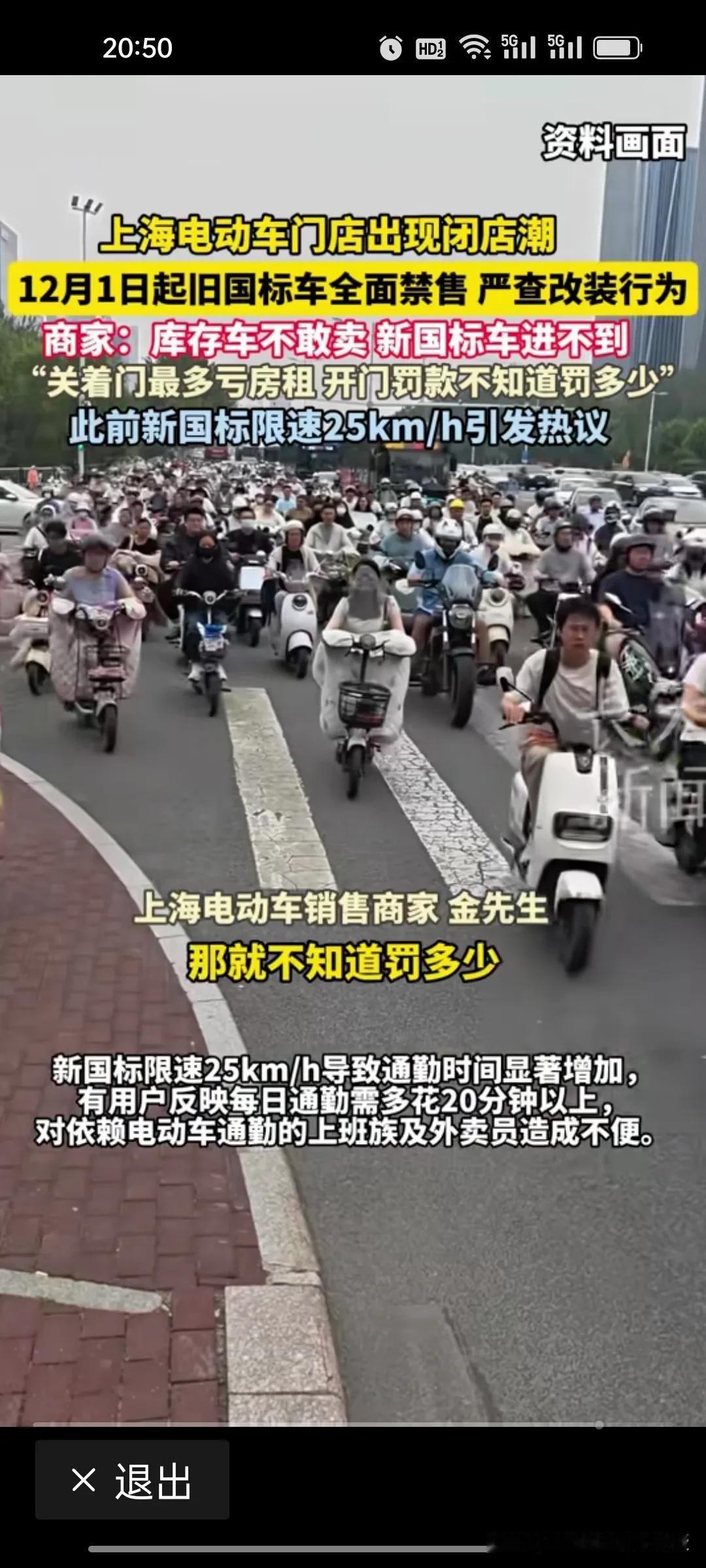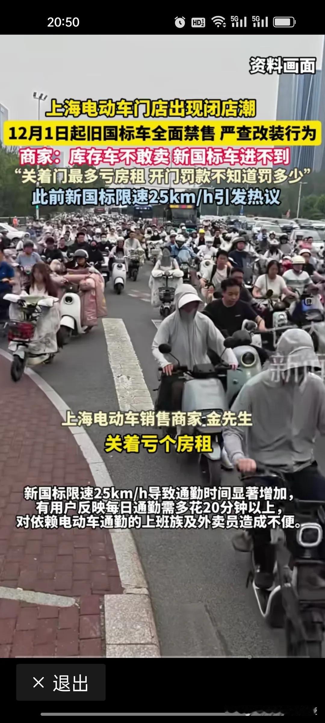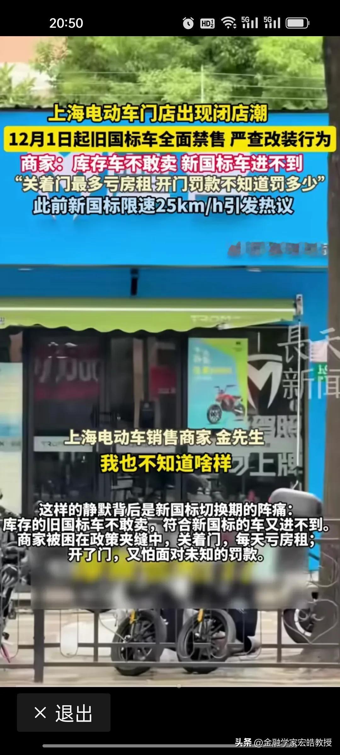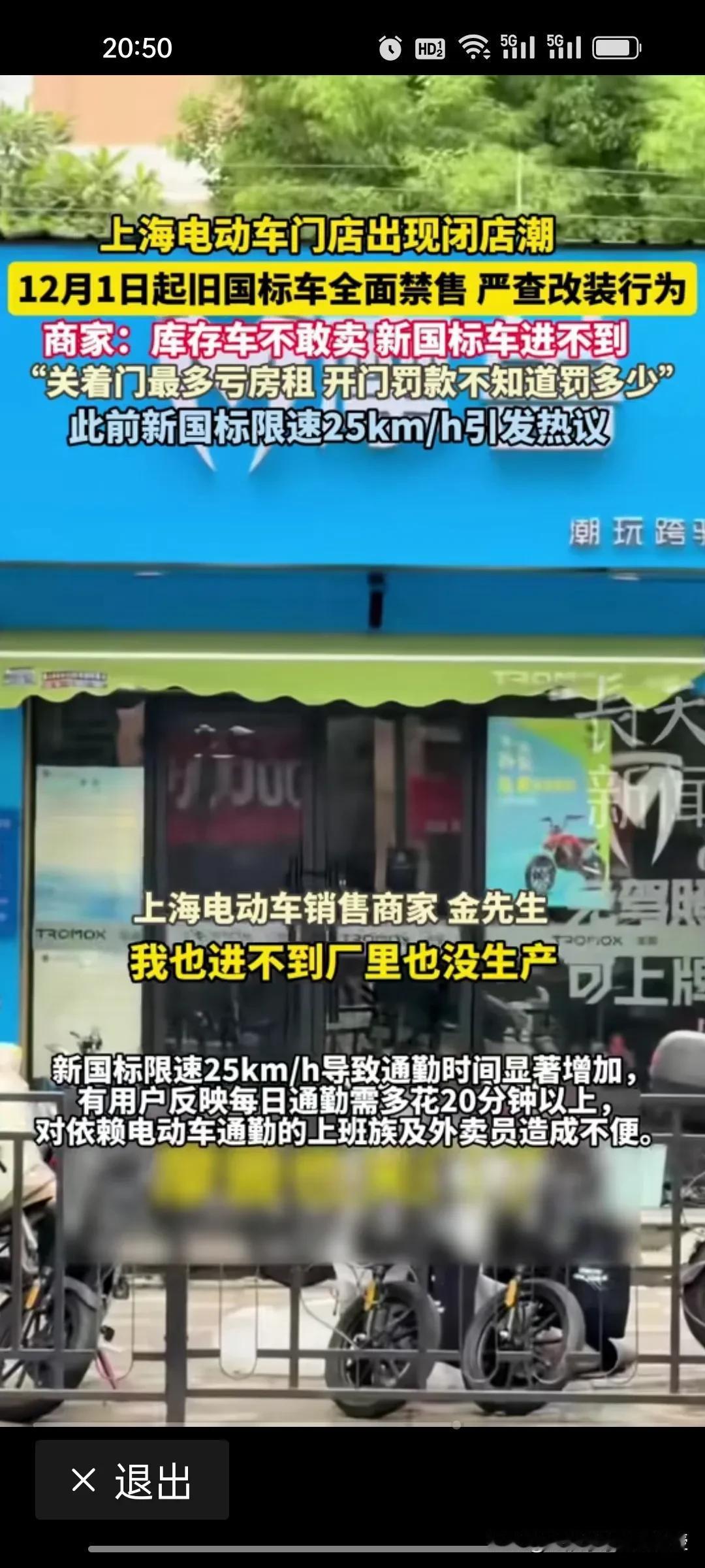 上海电动车销售商家出现闭店潮已经持续一周。一位电动车销售商金先生说,现在新国标的车进不到,旧国标的车不让卖,店开着会罚款,关店最多亏房租。从12月1日起,旧国标的车不能卖了,也不能改装。有消费者说,新国标的电动车25千米/时的速度比正常通勤时间要慢20分钟以上。 现在处在新旧转换的政策期,我认为关键点在于要拓宽电动车经销商的新货进货渠道,要是货源充足,他们还是可以赚到钱的,希望上海像这样持续一周的闭店可以尽快恢复开张。另外,新国标车的生产商也要加快力度生产,毕竟这是日常通勤的刚需。