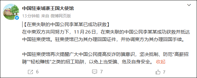 据中国驻柬埔寨大使馆消息,在中柬双方共同努力下,11月26日,在柬失联的中国公民李某某成功获救并抵达中国驻柬使馆。驻柬使馆已为其办理回国证件,并协调柬方为其办理回国手续。