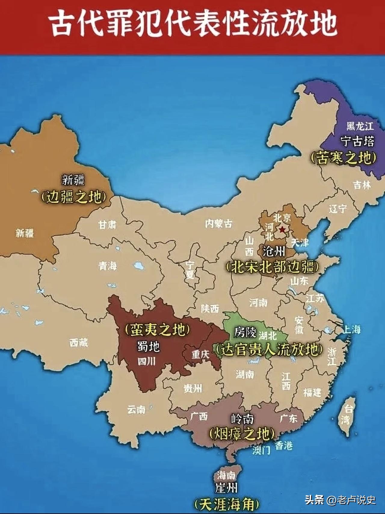 古代十大犯人流放地,在古代的犯罪刑罚中,仅次于死罪的就是流放三千里,因路途坎坷和流放地环境恶劣,被流放的犯人几乎很难活着回归故乡,除非遇到皇帝大赦,当然,那是最严重的流放处罚,而像巴蜀、房陵这些比较近的流放地,环境较好,则属于达官贵人的专属地,随时都有重返朝廷的时候。 历史冷知识 历史地图