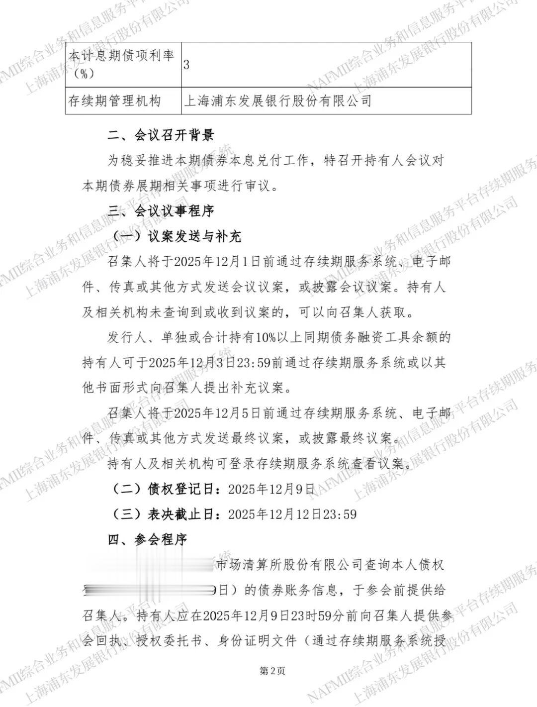 到了今天晚上,浦发银行一则公告,揭开了今天万科债暴跌的原因。作为本次会议的召集人,召开持有人会议对“22万科MTN004”债券展期相关事项进行审议。这笔2022年度第四期中期票据余额20亿元,本金兑付日,为2025年12月15日。