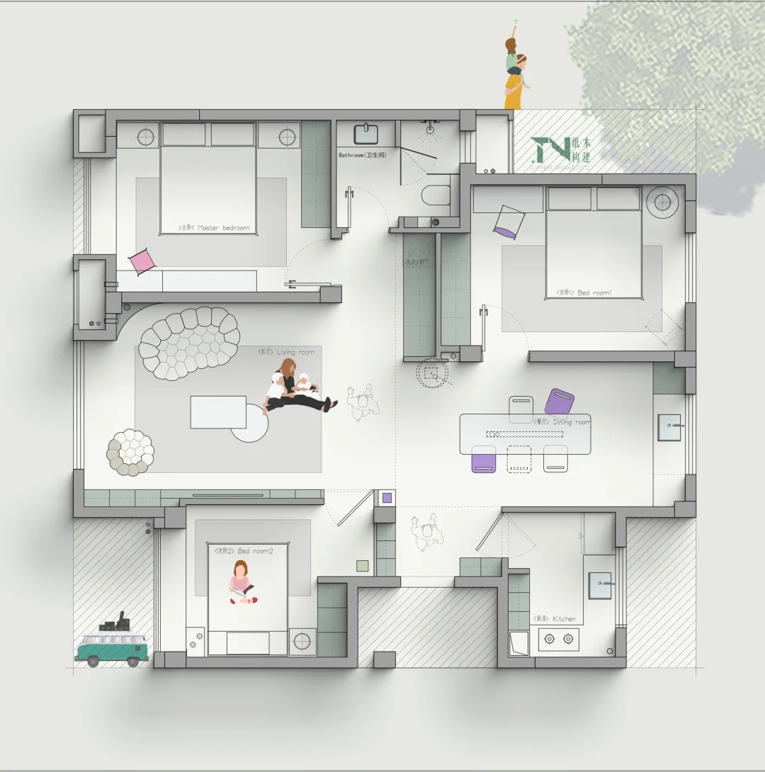 设计需求: 1、三口之家,夫妻二人,女儿四年级, 2、需要三房,需要一个可以在一起学习看书的地方或者书房 3、可以考虑不要阳台,考虑洗烘一体机。奶奶经常过来帮带小孩,有时候会过夜。 4、考虑要二胎,卫生间可以做到三分离最好