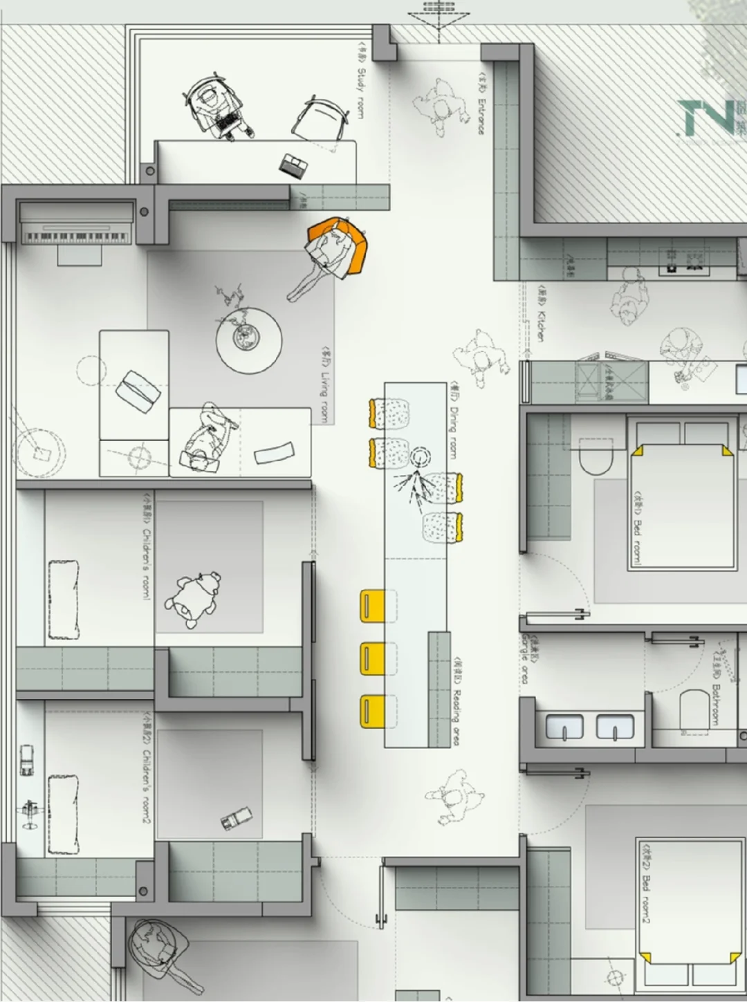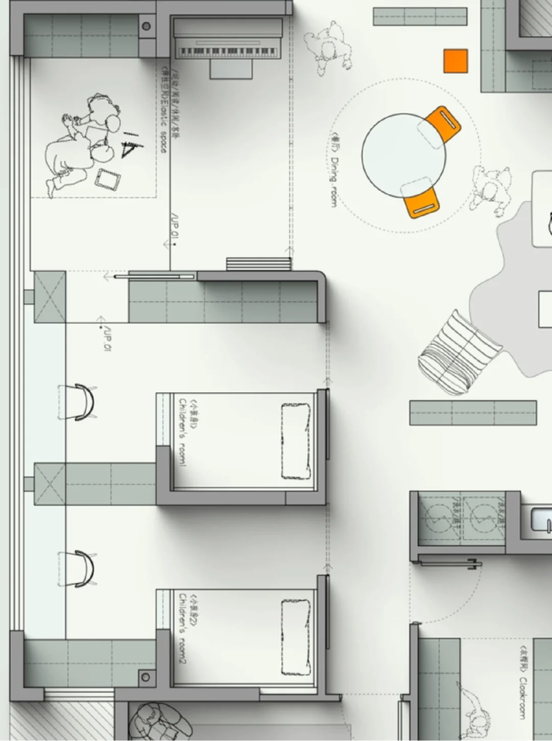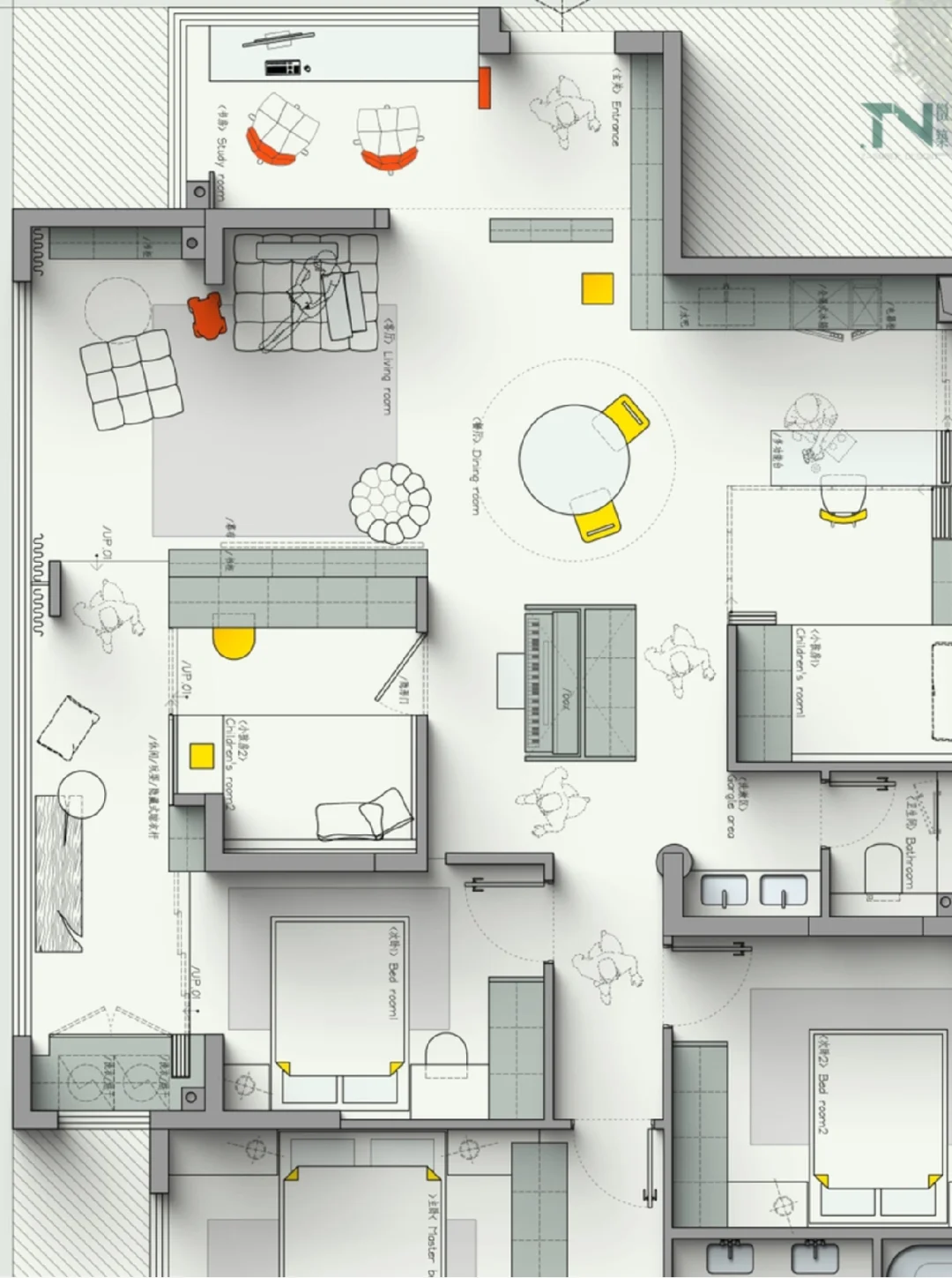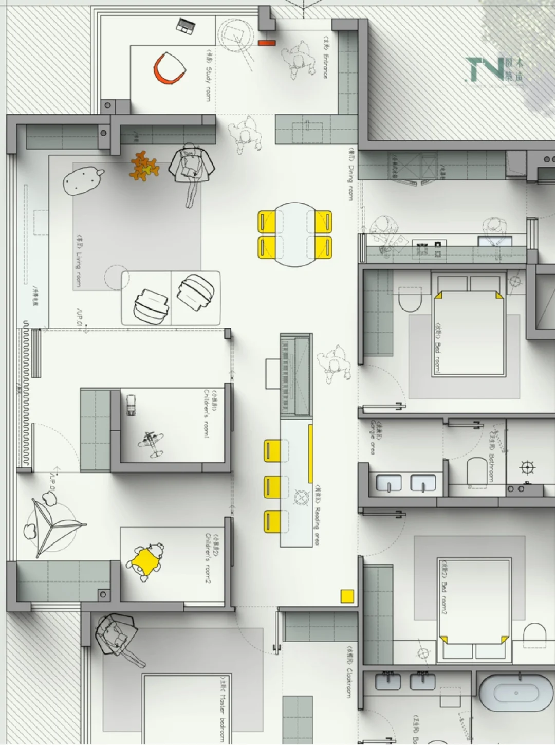 不够,那就变个六居室吧! 家庭成员: 夫妻俩,一个女宝宝,一个男宝宝,爷爷奶奶,外公外婆 设计需求: 1、主卧套间,衣柜储物大,主卫需要双台盆、浴缸 2、两个长辈房(孩子小需要照顾) 3、两个孩子房 4、办公的书房 5、以后孩子长大的学习区 6、找个地方放钢琴 7、厨房封闭(最好可以中西厨)
