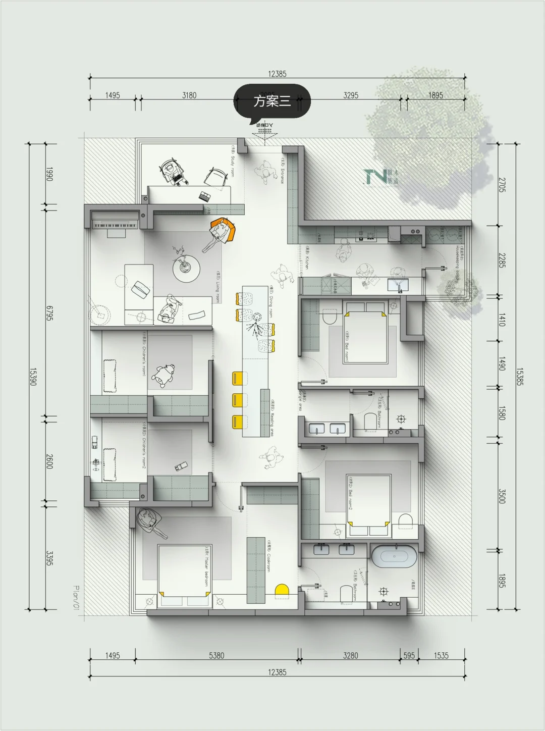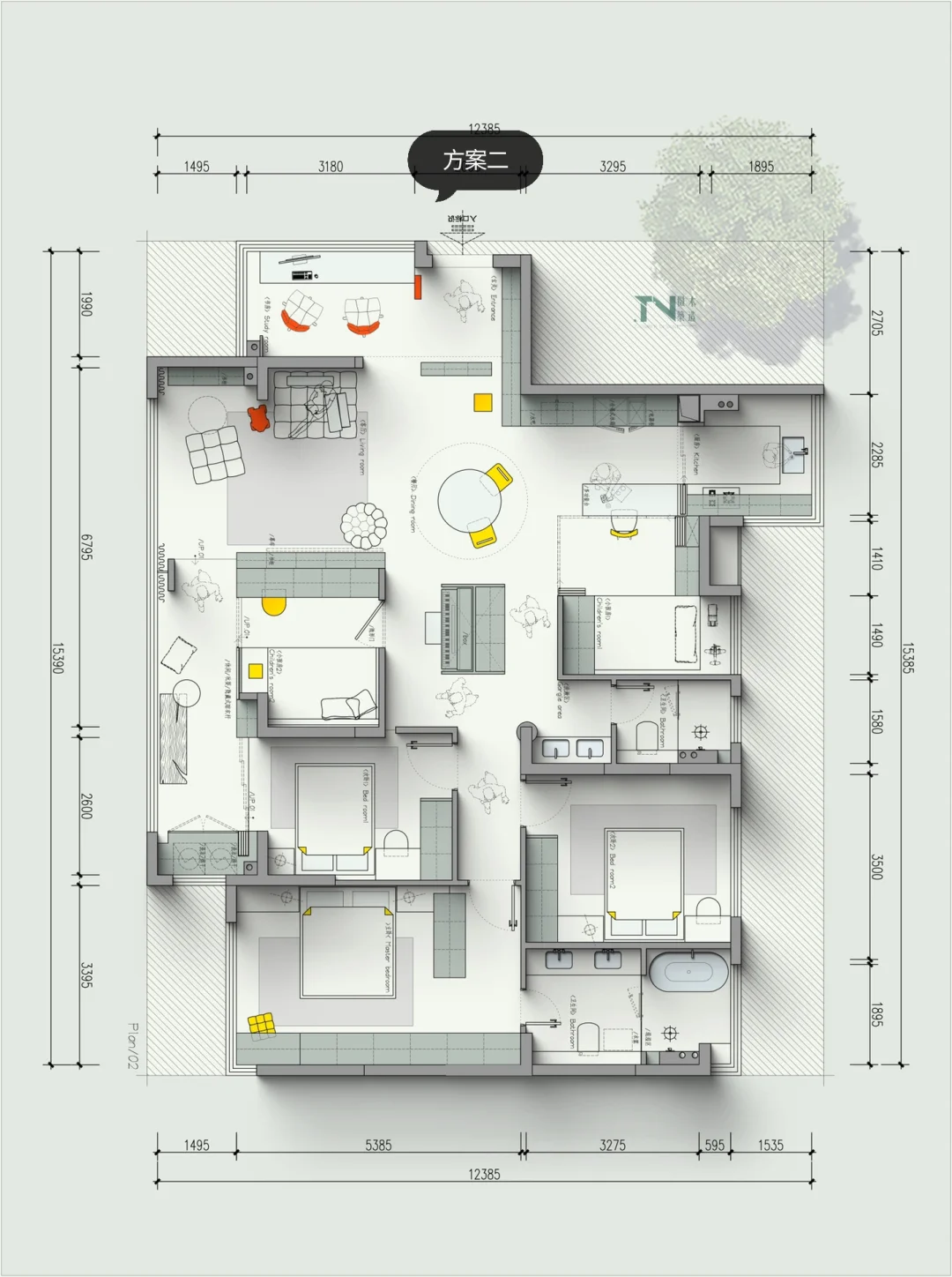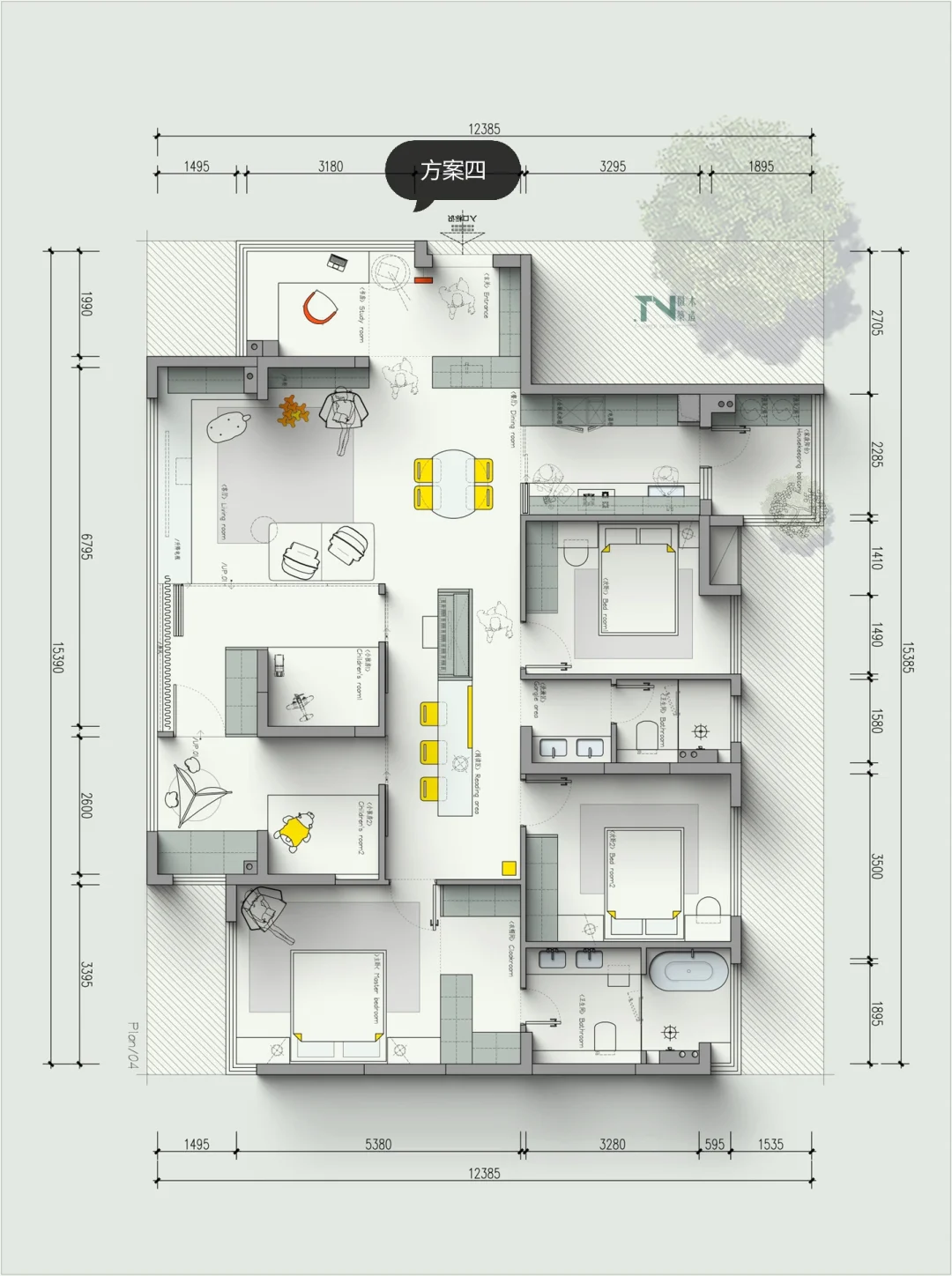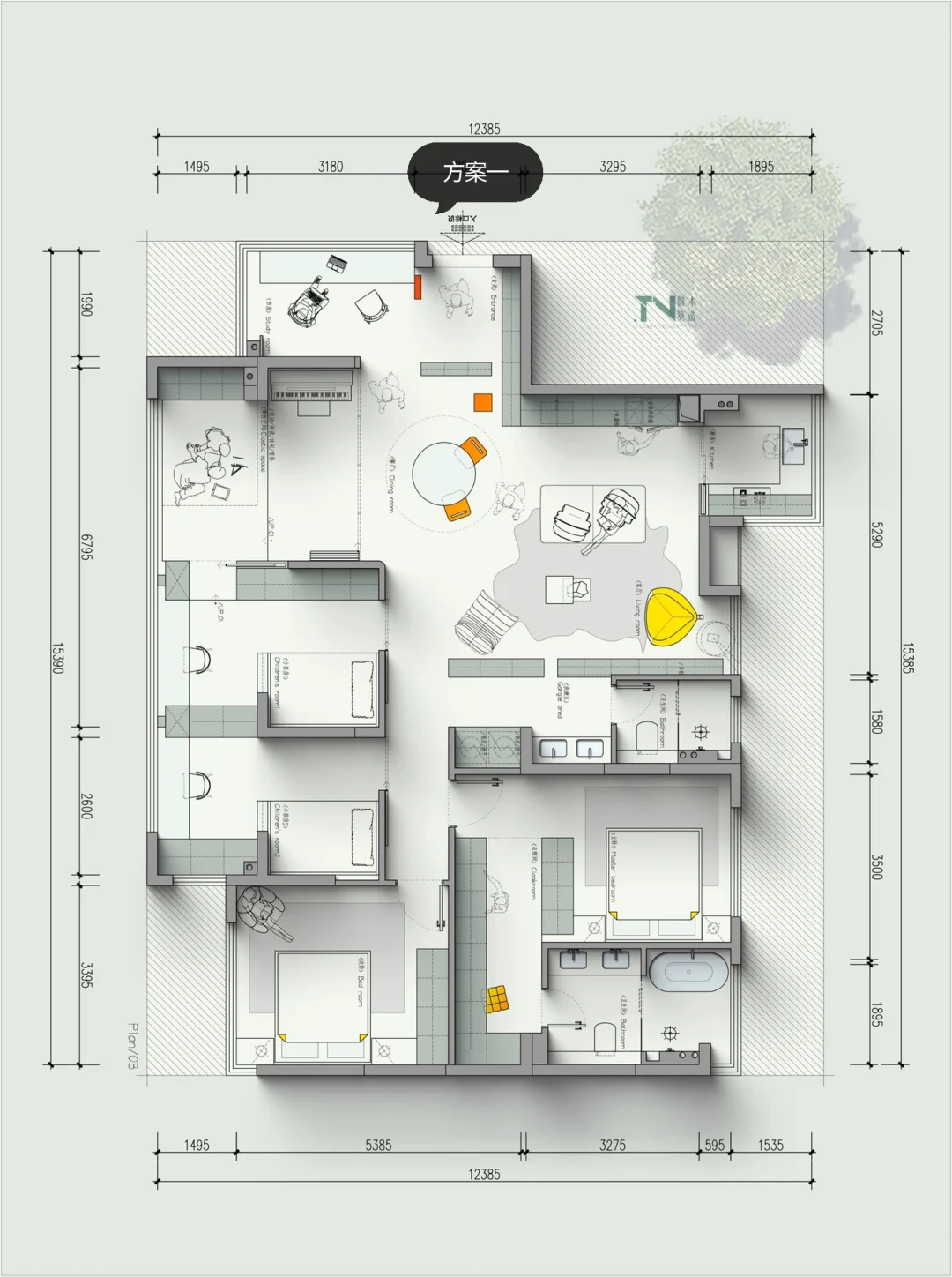 不够,那就变个六居室吧! 家庭成员: 夫妻俩,一个女宝宝,一个男宝宝,爷爷奶奶,外公外婆 设计需求: 1、主卧套间,衣柜储物大,主卫需要双台盆、浴缸 2、两个长辈房(孩子小需要照顾) 3、两个孩子房 4、办公的书房 5、以后孩子长大的学习区 6、找个地方放钢琴 7、厨房封闭(最好可以中西厨)