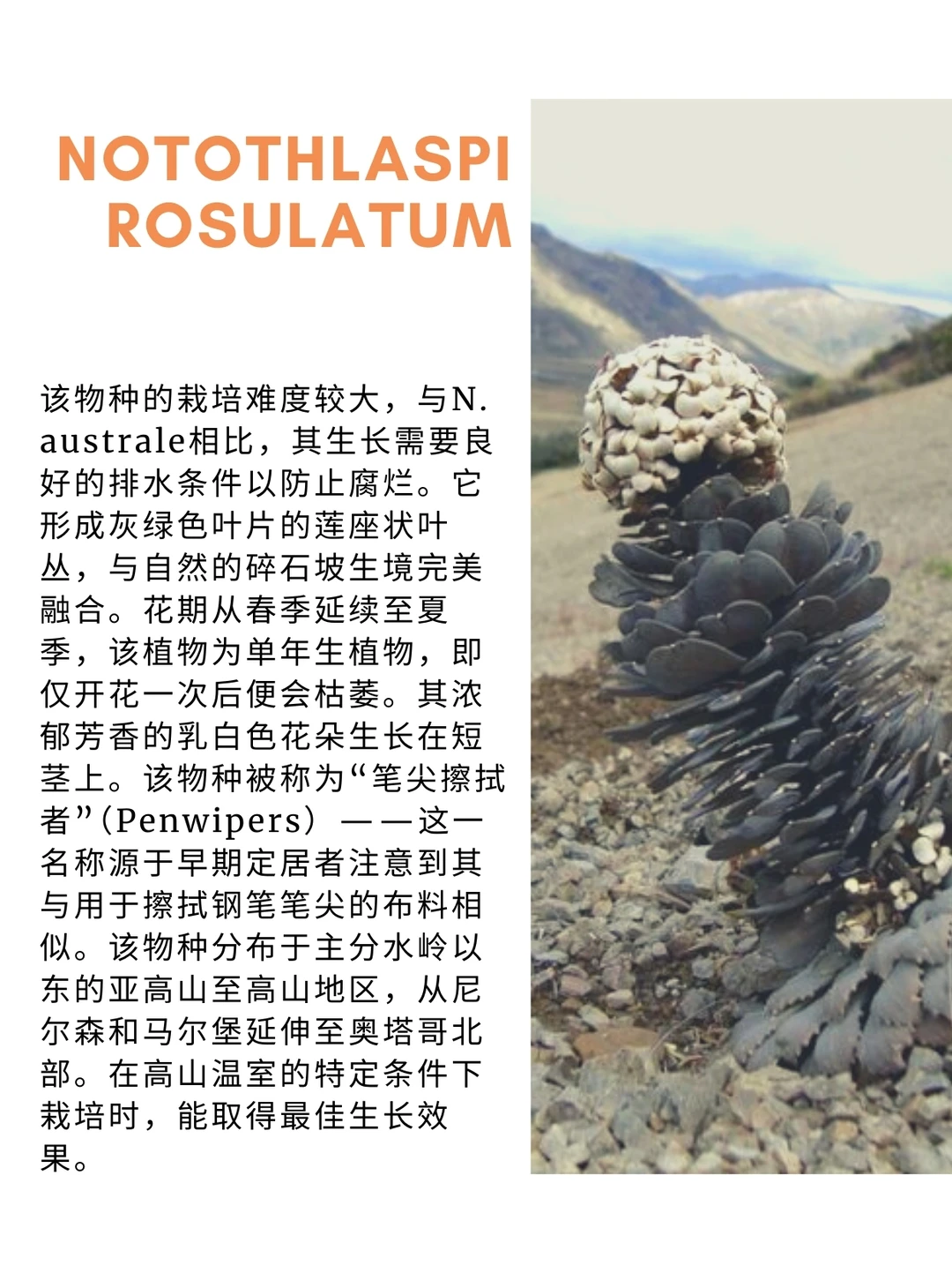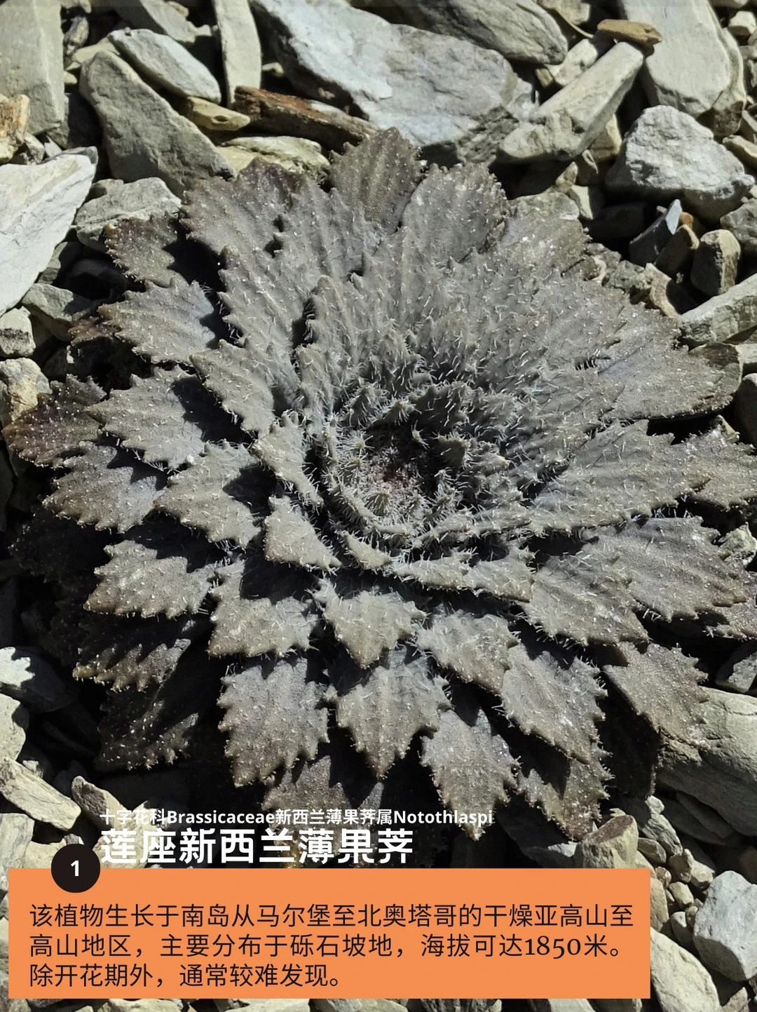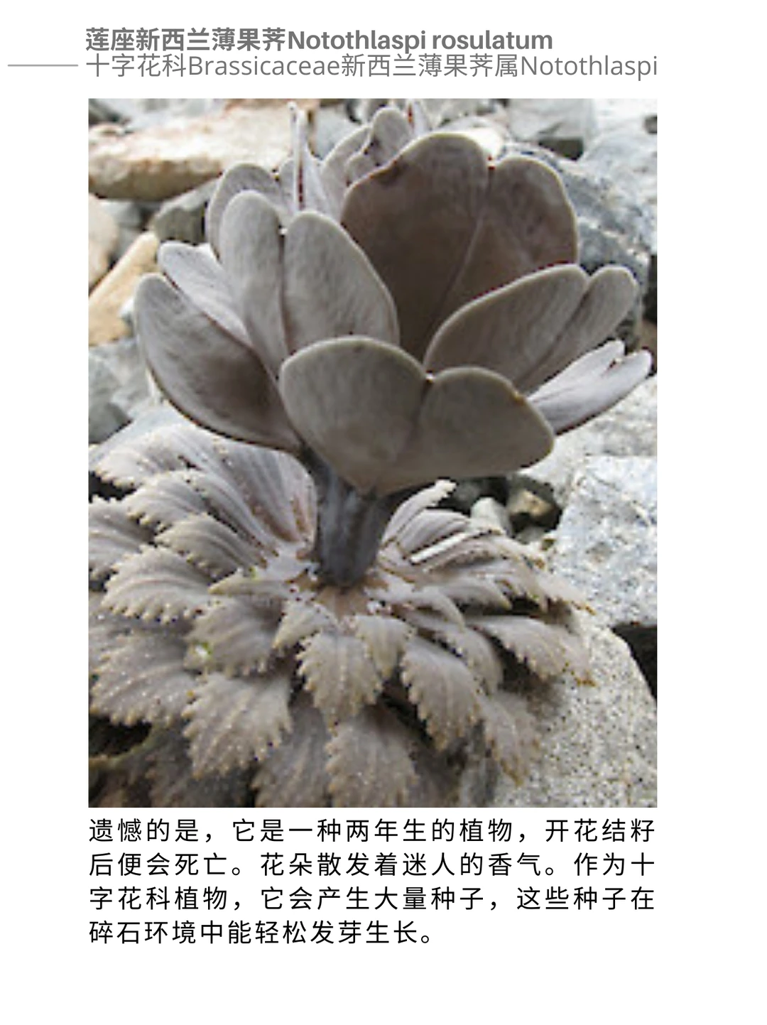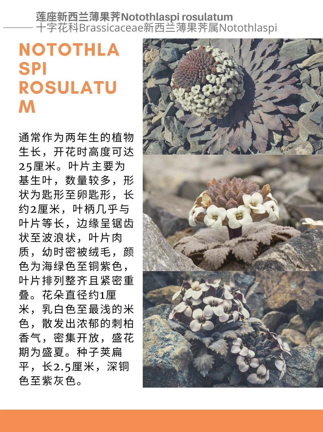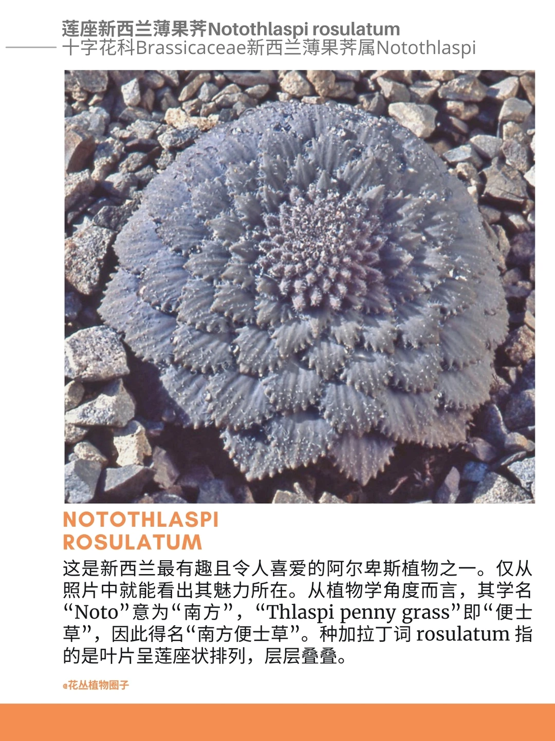 这是新西兰最有趣且令人喜爱的阿尔卑斯植物之一。仅从照片中就能看出其魅力所在。从植物学角度而言,其学名“Noto”意为“南方”,“Thlaspi penny grass”即“便士草”,因此得名“南方便士草”。种加拉丁词 rosulatum 指的是叶片呈莲座状排列,层层叠叠。