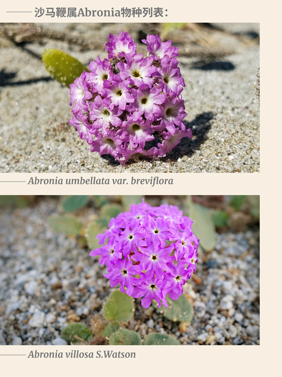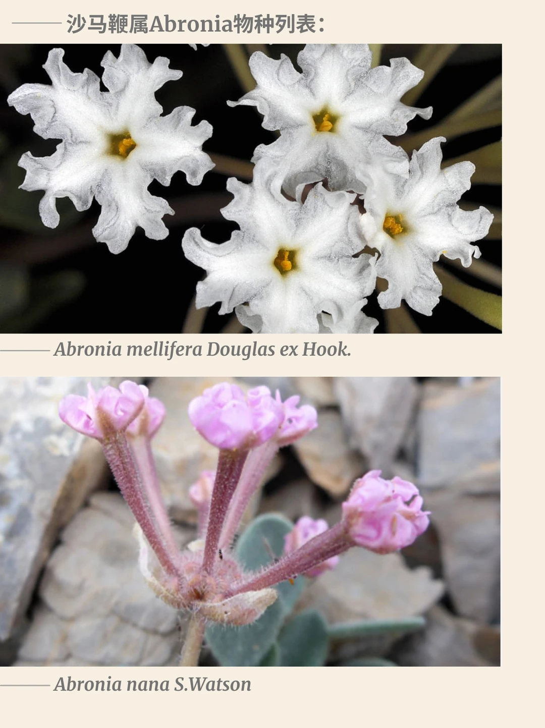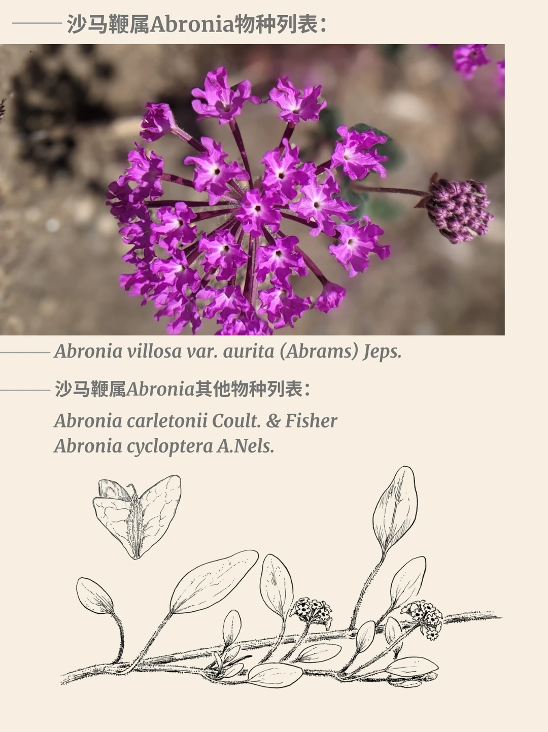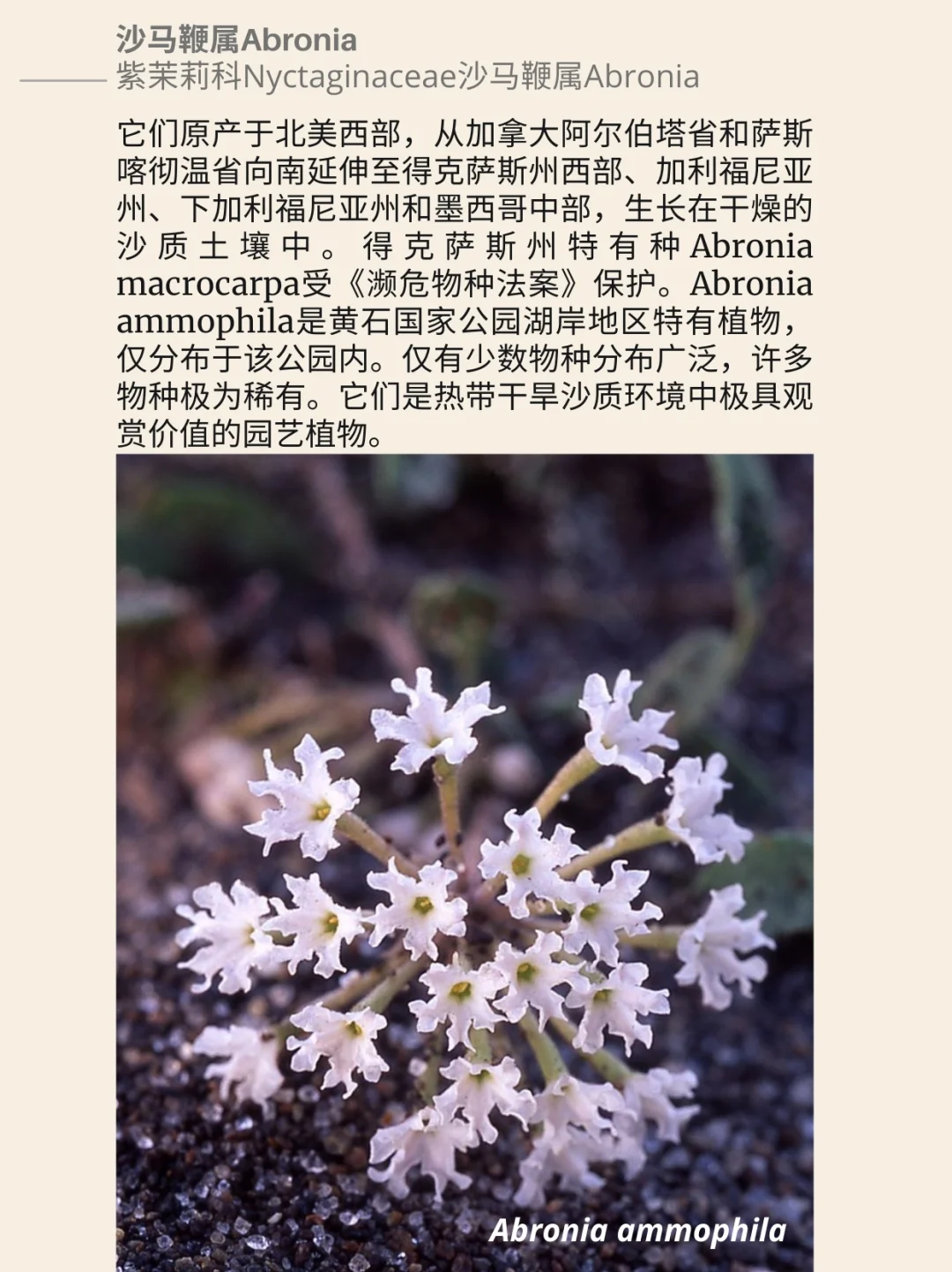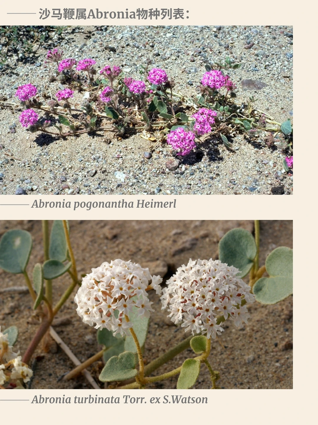 紫茉莉科 沙马鞭属 Abronia 一年生 多年生 黄石公园 根茎类蔬菜 马鞭草属 马缨丹属 花园植物 沙马鞭属Abronia,又称沙蒿或野金盏花,是紫茉莉科Nyctaginaceae下的一种草本植物属,包含约20个物种,包括一年生和多年生草本植物。尽管有这些常见名称,它们与马鞭草科Verbenaceae中的马鞭草属Verbena或马缨丹属Lantana并无亲缘关系。它们与Tripterocalyx属亲缘关系密切。