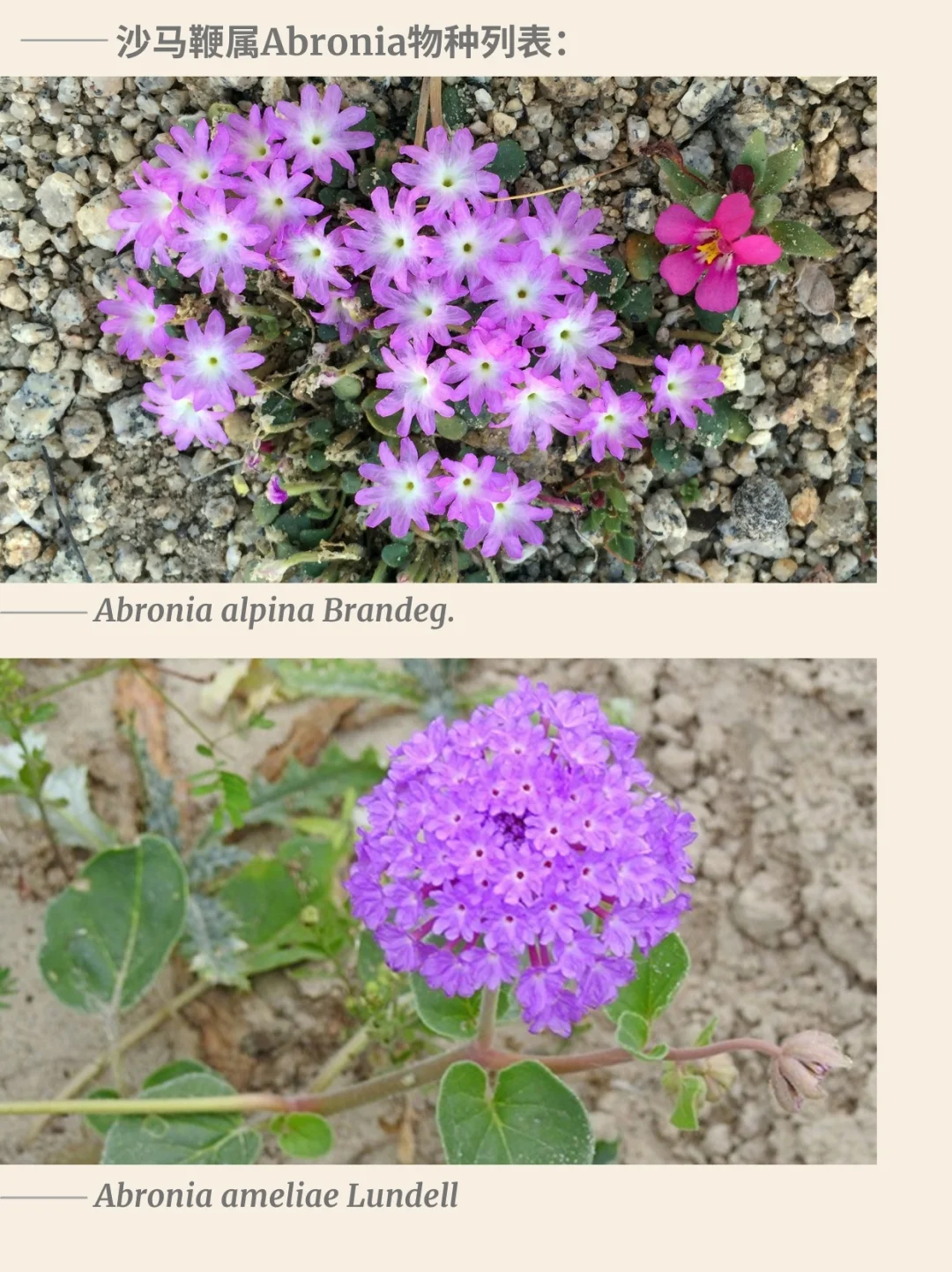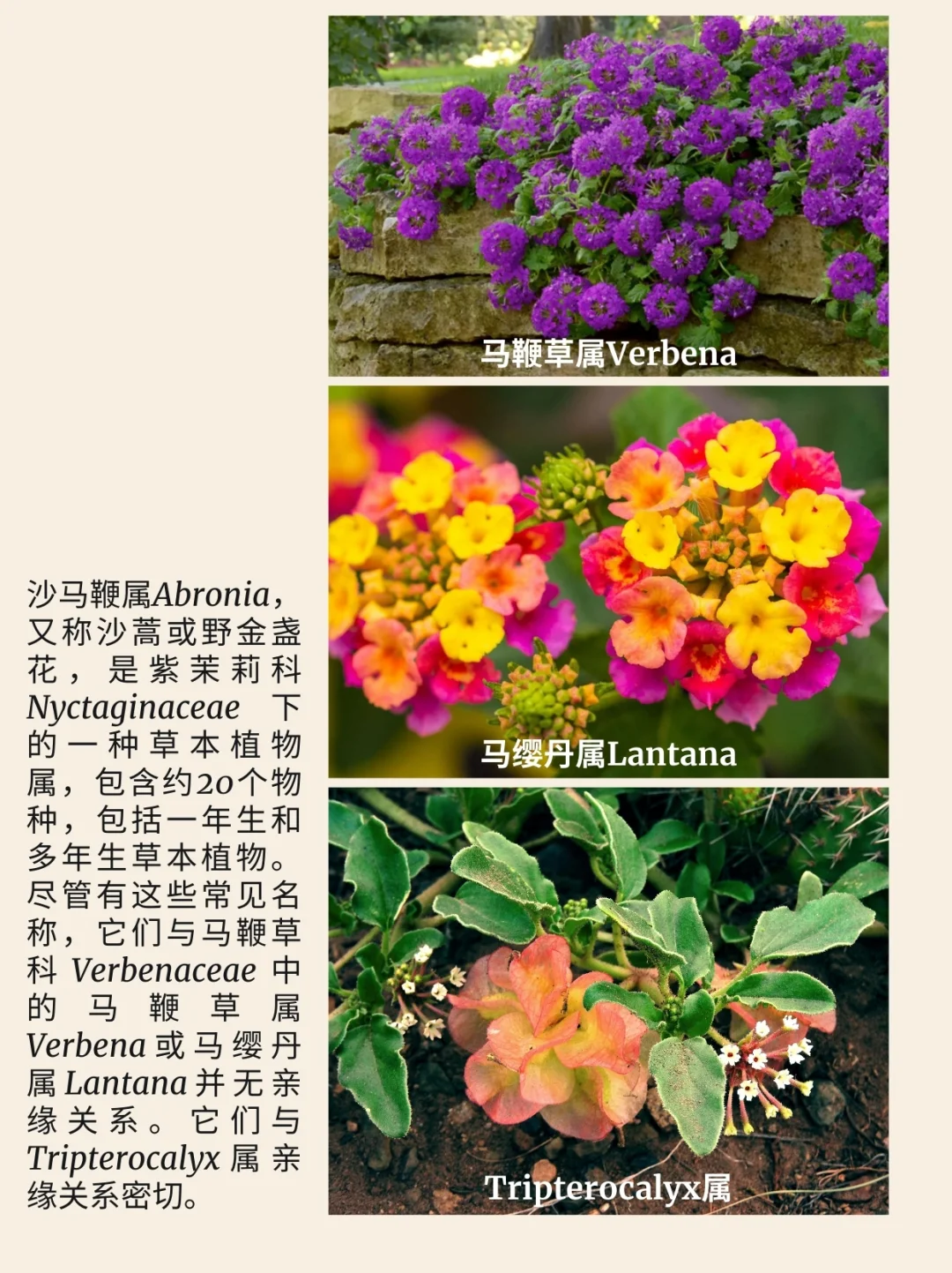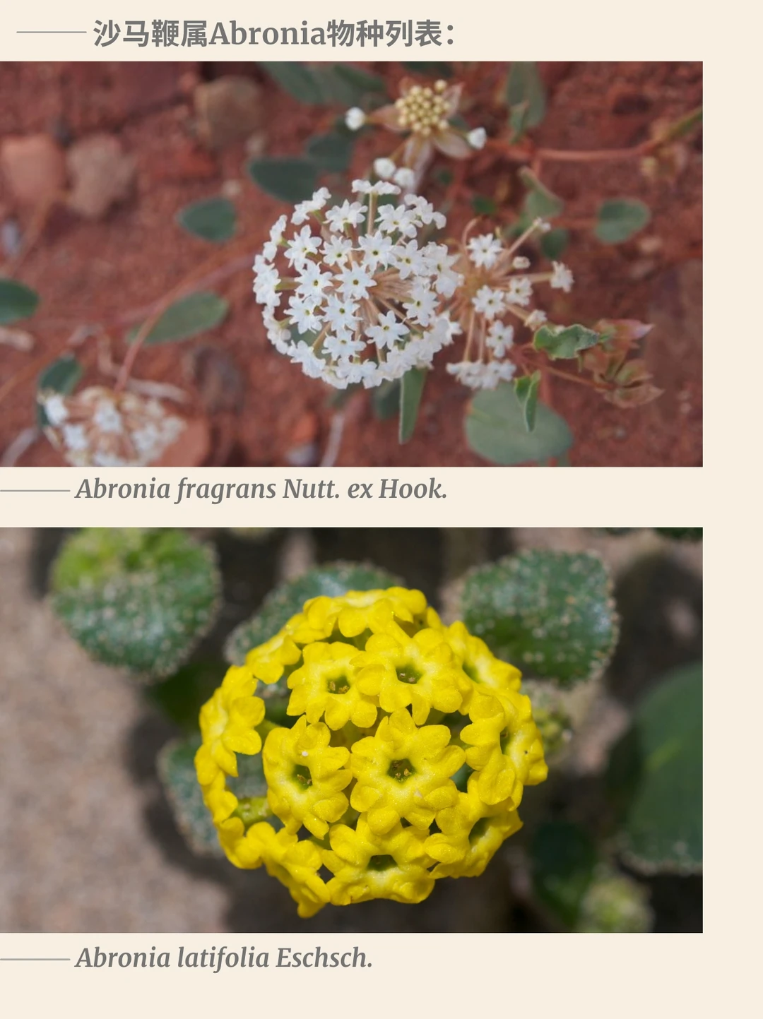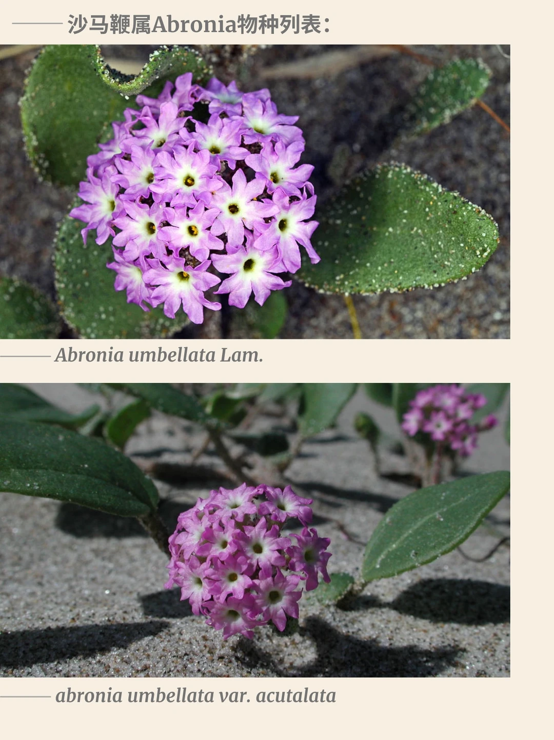 紫茉莉科 沙马鞭属 Abronia 一年生 多年生 黄石公园 根茎类蔬菜 马鞭草属 马缨丹属 花园植物 沙马鞭属Abronia,又称沙蒿或野金盏花,是紫茉莉科Nyctaginaceae下的一种草本植物属,包含约20个物种,包括一年生和多年生草本植物。尽管有这些常见名称,它们与马鞭草科Verbenaceae中的马鞭草属Verbena或马缨丹属Lantana并无亲缘关系。它们与Tripterocalyx属亲缘关系密切。