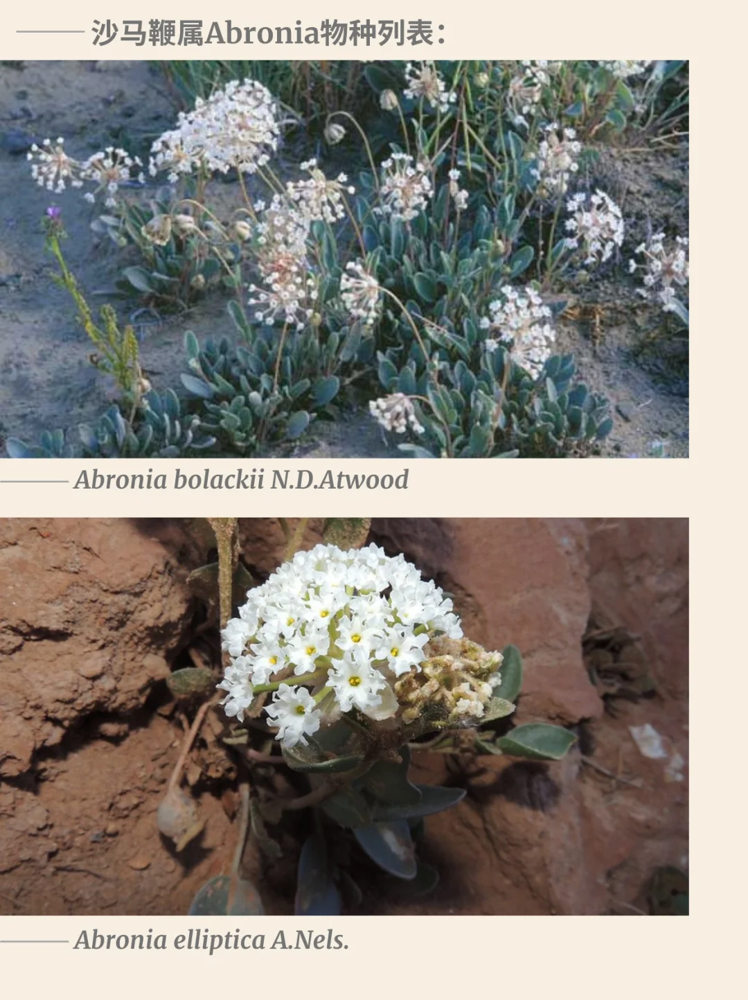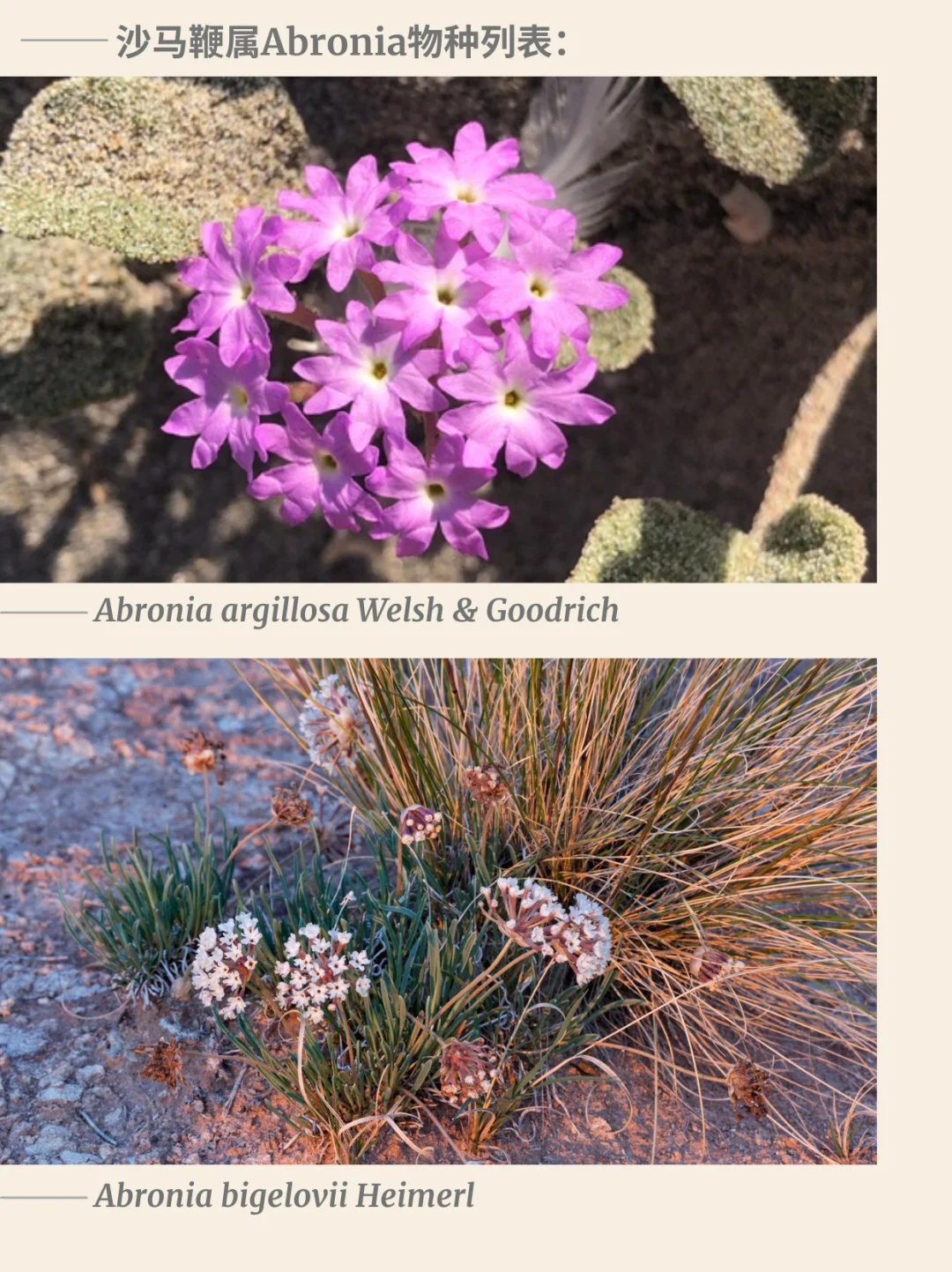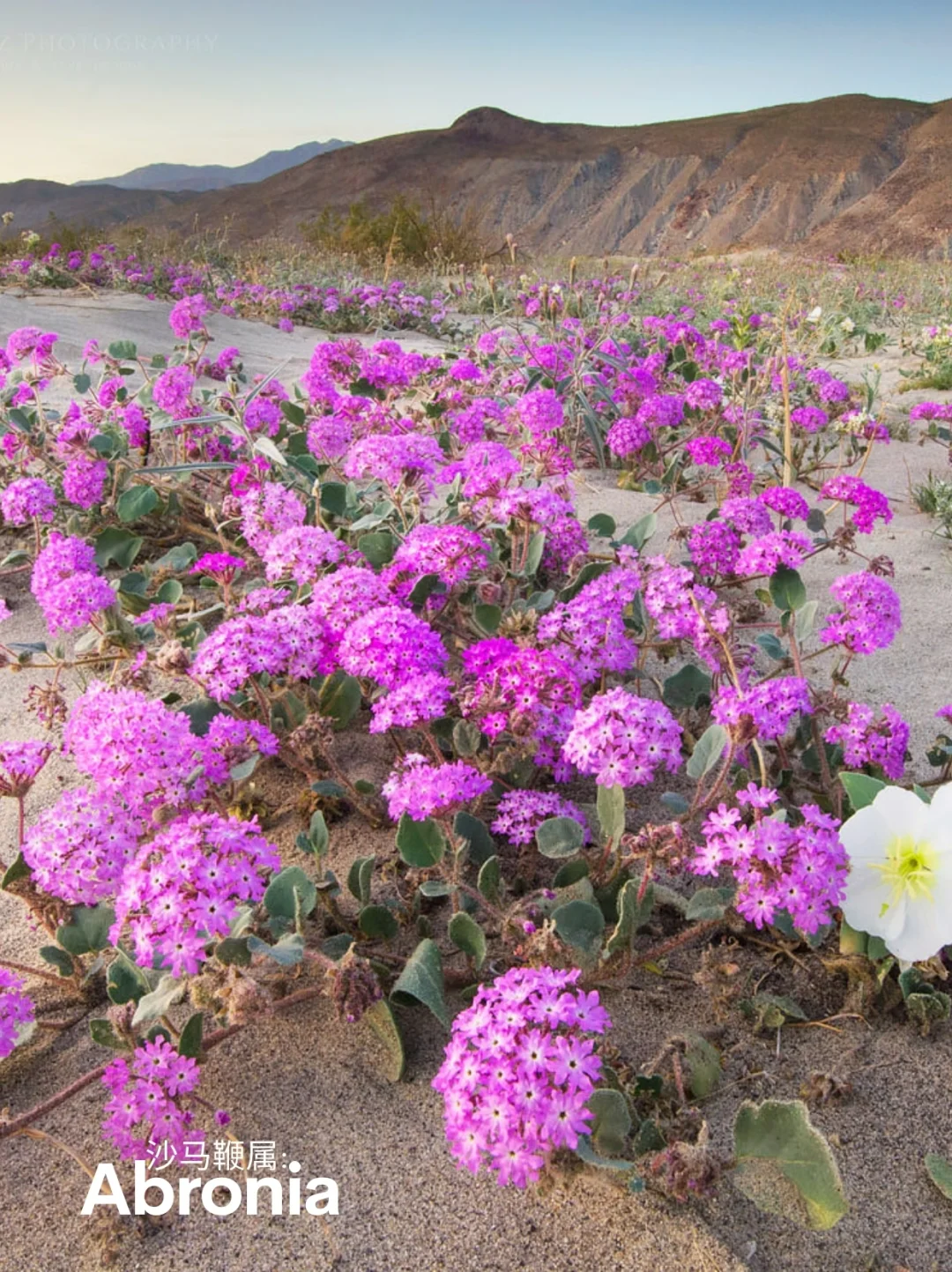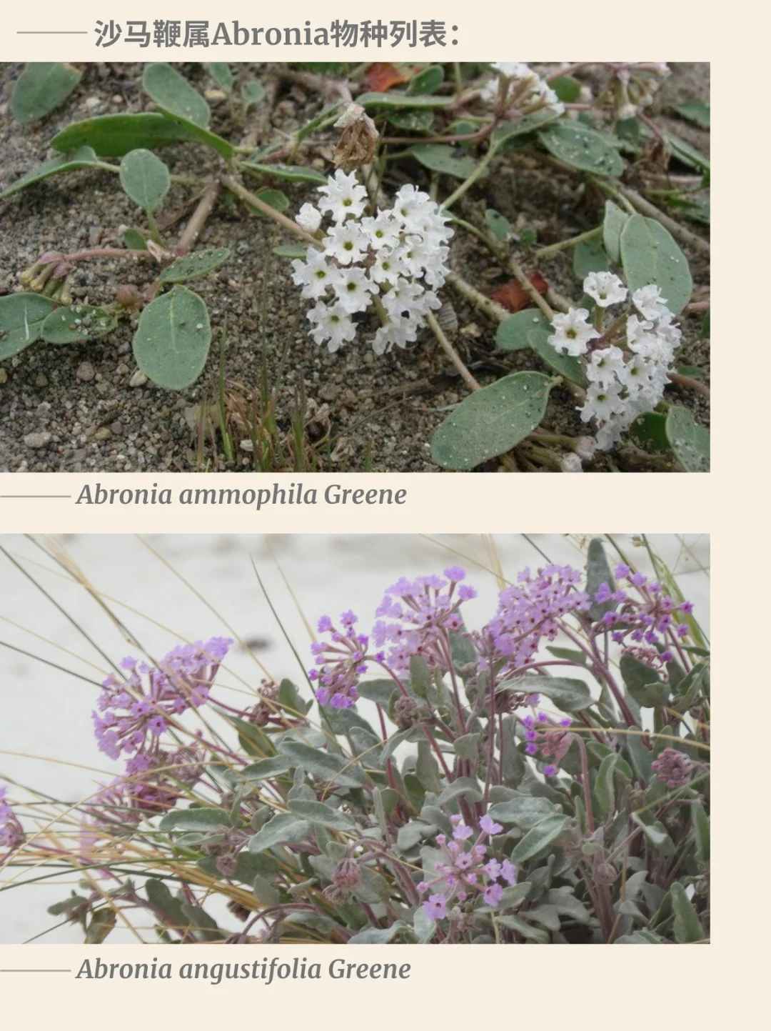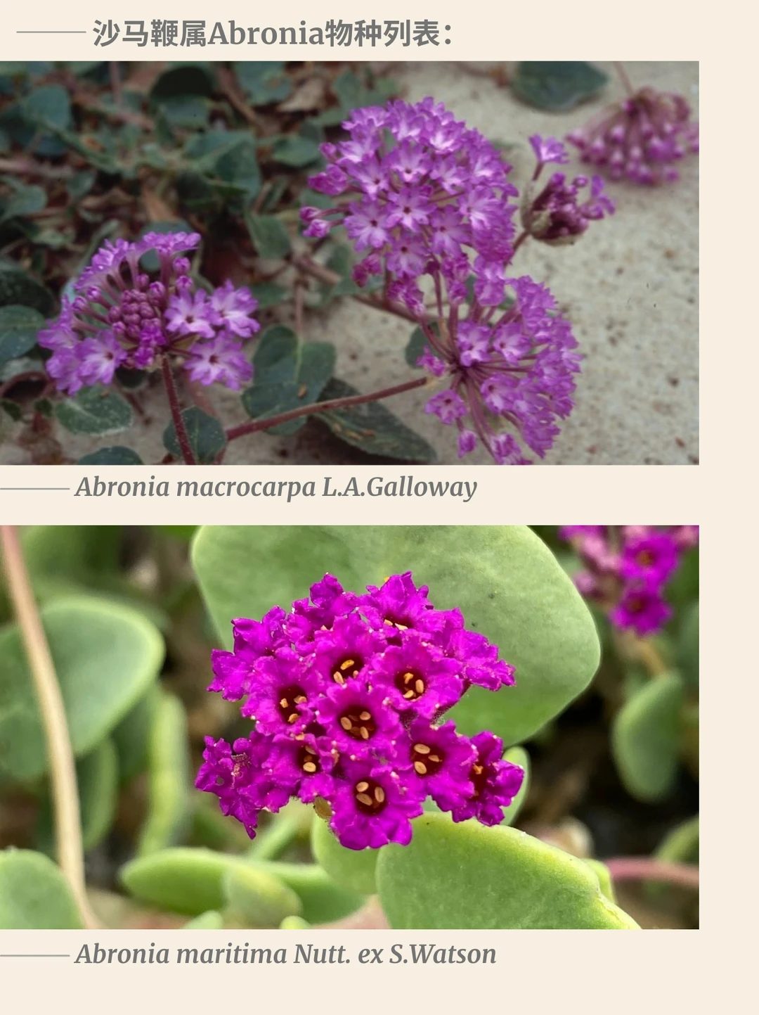 紫茉莉科 沙马鞭属 Abronia 一年生 多年生 黄石公园 根茎类蔬菜 马鞭草属 马缨丹属 花园植物 沙马鞭属Abronia,又称沙蒿或野金盏花,是紫茉莉科Nyctaginaceae下的一种草本植物属,包含约20个物种,包括一年生和多年生草本植物。尽管有这些常见名称,它们与马鞭草科Verbenaceae中的马鞭草属Verbena或马缨丹属Lantana并无亲缘关系。它们与Tripterocalyx属亲缘关系密切。