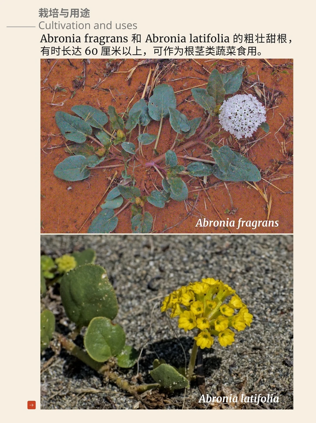 Abronia fragrans 和 Abronia latifolia 的粗壮甜根,有时长达 60 厘米以上,可作为根茎类蔬菜食用。