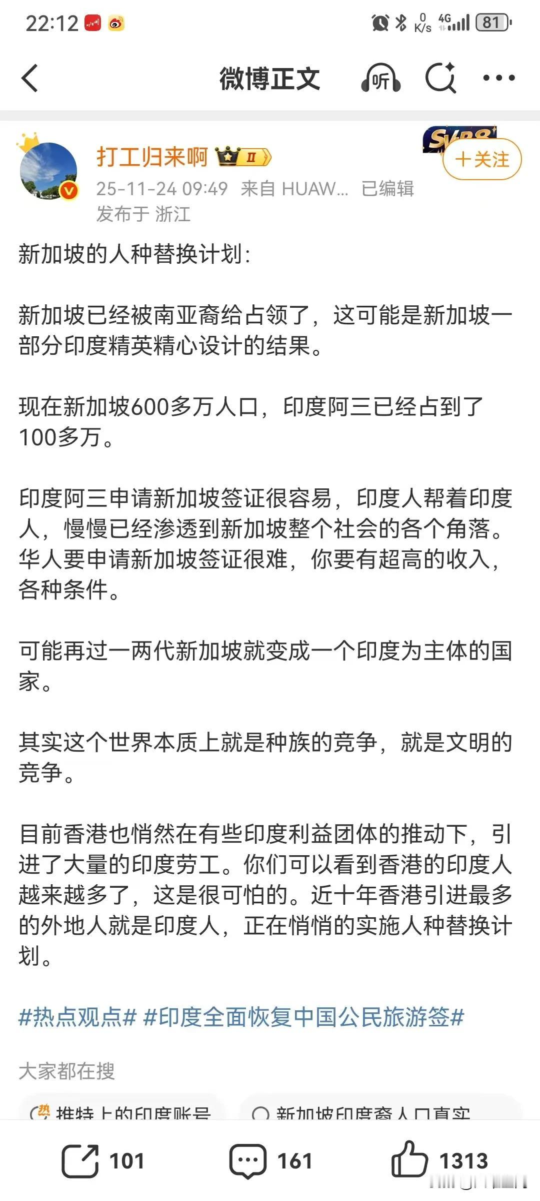 新加坡华人天天防着华人,而新加坡的印度裔恰恰相反,大量引进印度人,然后印度裔精英大量进入新加坡的政府,连新加坡总统和外长都是印度裔,新加坡六七百万人,户籍的印度裔可能只有100多万,但新加坡的非户籍人口有200多万,大部分是印度裔,估计就是这些户籍印度裔带进新加坡的亲属之类的,所以纯按人口算,新加坡华人还真的不一定占优势,而新加坡华人却依旧当着华人,实际窝已经被印度人头了,只要是华人有点什么问题,它们各种刁难,各种严格要求,而印度裔聚会,各种垃圾和噪音,新加坡警察连管都不管,所以真的看不懂新加坡华人精英为什么要这样做,难道真的彻底西化了吗?