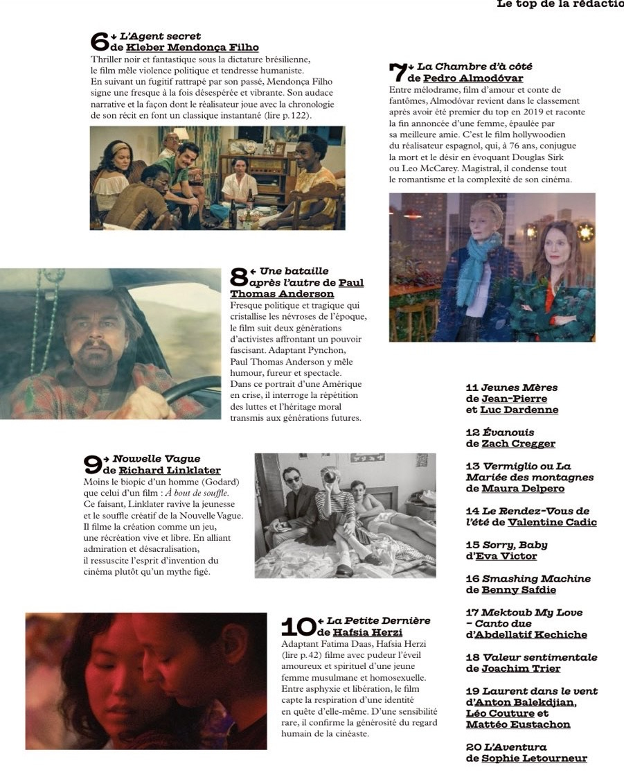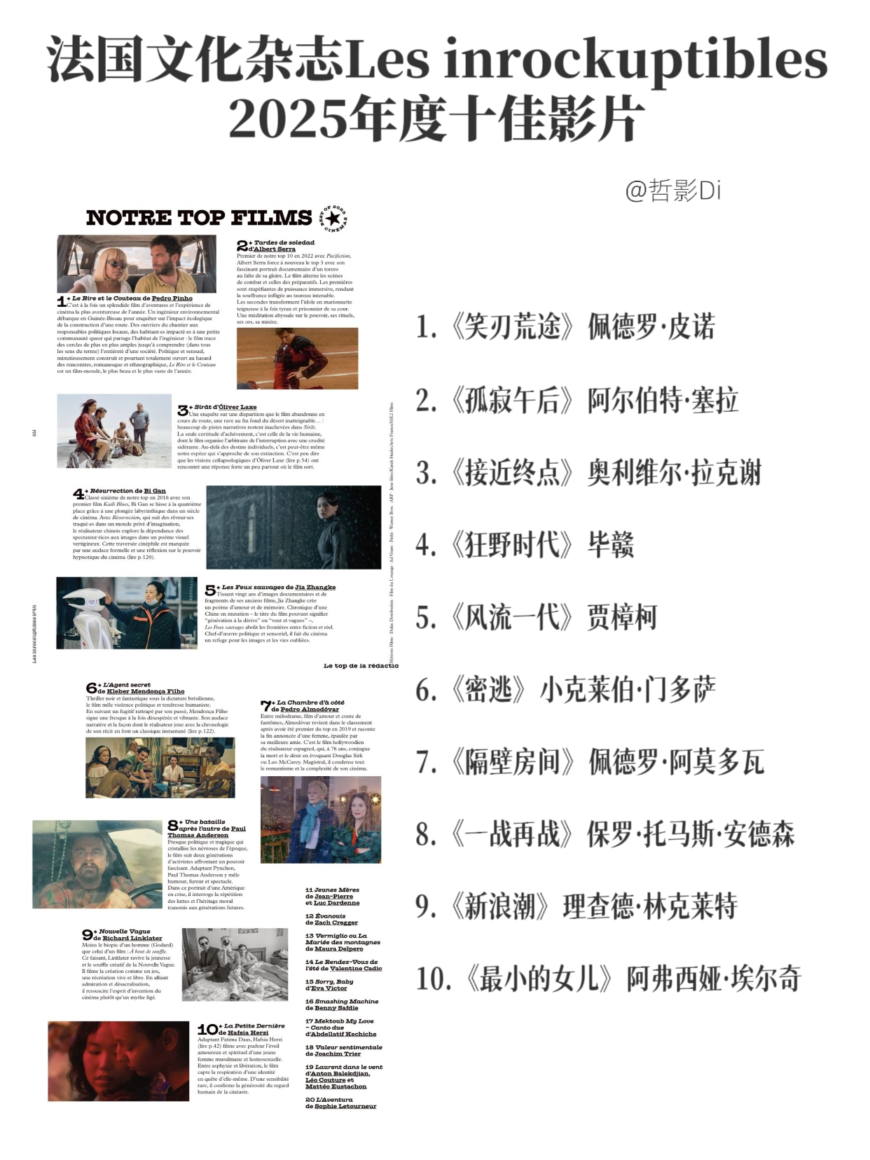 法国文化杂志Les inrockuptibles发布2025年度十佳影片,毕赣执导,易烊千玺、舒淇主演的中国电影《狂野时代》与贾樟柯执导,赵涛主演的中国电影《风流一代》双双跻身前五名。以下为十佳影片片单↓ ↓ ↓1.《笑刃荒途》佩德罗·皮诺2.《孤寂午后》阿尔伯特·塞拉3.《接近终点》奥利维尔·拉克谢4.《狂野时代》毕赣5.《风流一代》贾樟柯6.《密逃》小克莱伯·门多萨7.《隔壁房间》佩德罗·阿莫多瓦8.《一战再战》保罗·托马斯·安德森9.《新浪潮》理查德·林克莱特10.《最小的女儿》阿弗西娅·埃尔奇