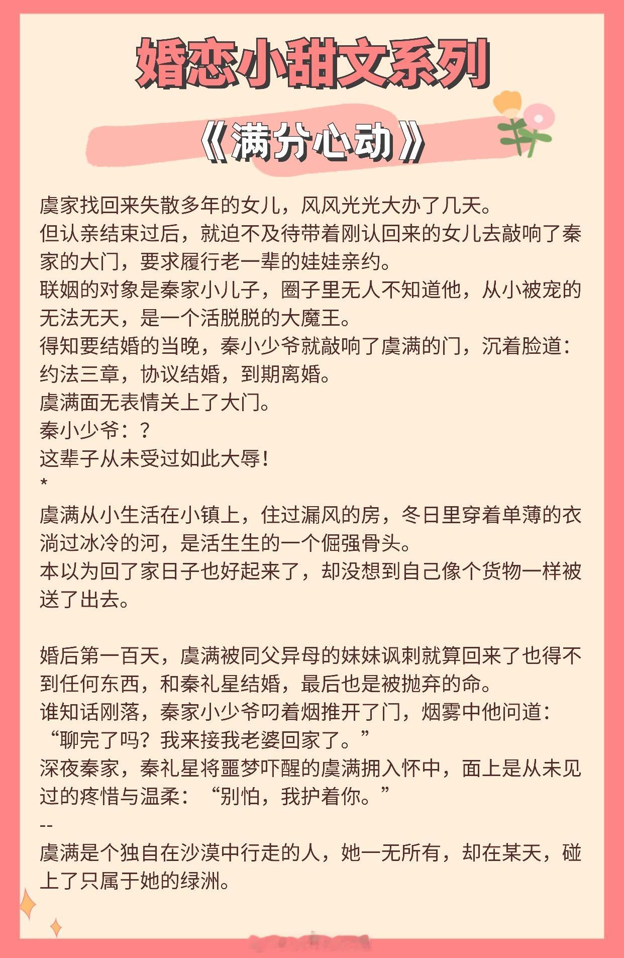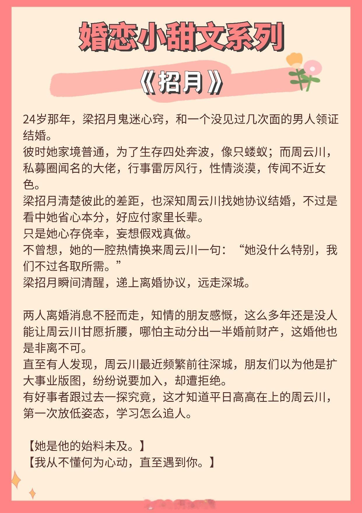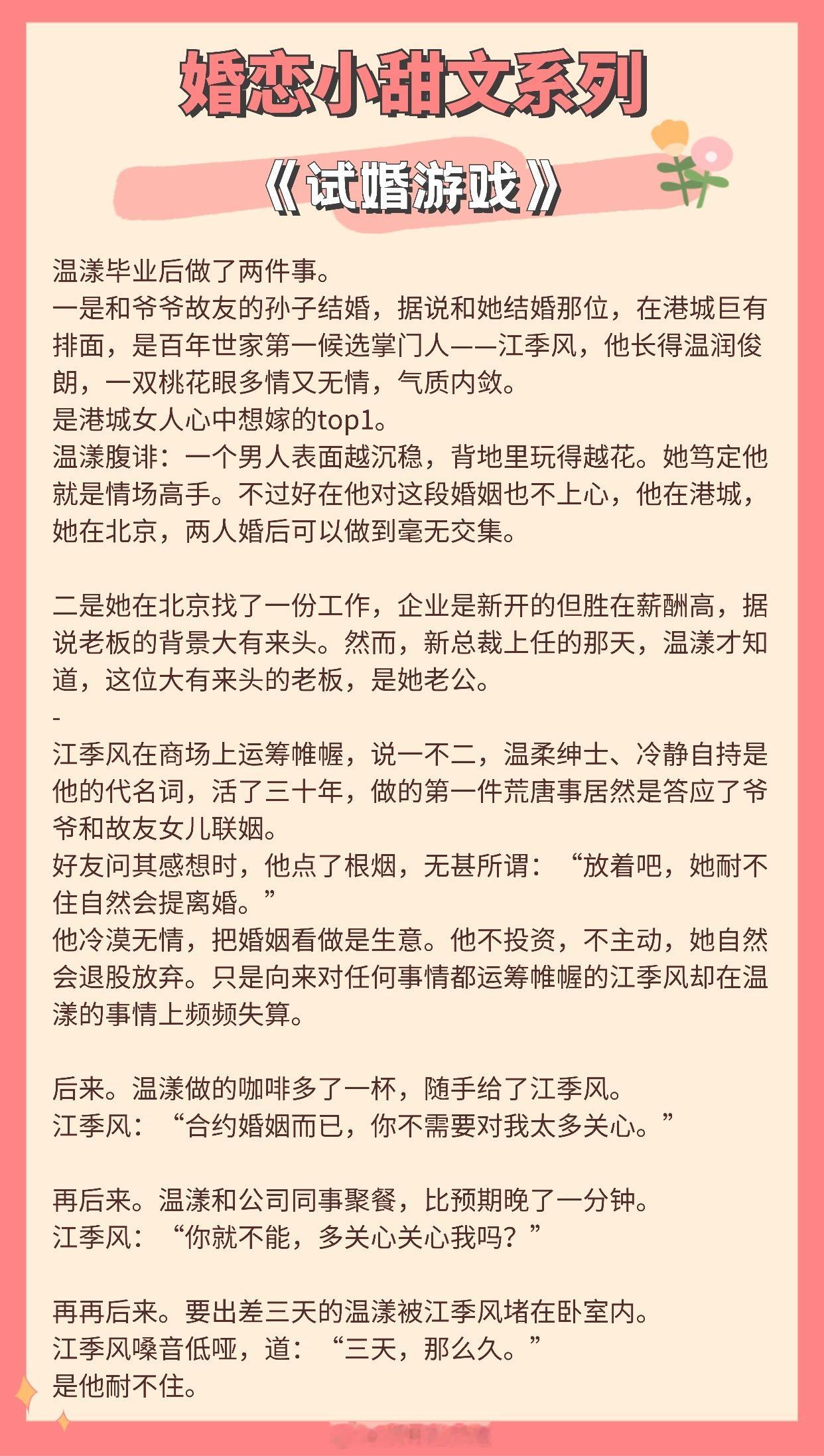 【婚恋小甜文】我从不懂何为心动,直至遇到你。《似是风雪故人归》作者:北途川《值此新婚》作者:归雪笺《从闪婚开始》作者:排骨辣酱《试婚游戏》作者:应雨竹《招月》作者:俞览《离婚纪念日》作者:零砚《婚后成瘾》作者:若诗安轩《满分心动》作者:丛梨《凛冬确多情》作者:随以推文言情小说推荐推文