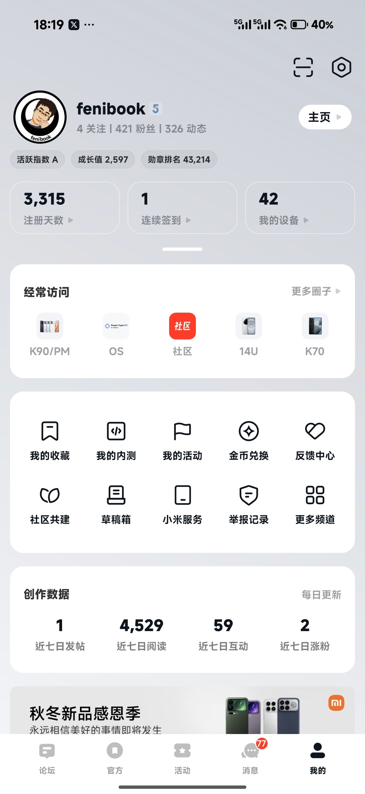 我魅族社区注册4418天,求超越,有比我更早的小伙伴吗?其实还有另一个更早账号,M8时期的,已经超过5000天,不过账号密码都忘了我小米社区注册3315天,其实我用小米手机也早都超过5000天了,只是当初没注册小米社区,哈哈哈