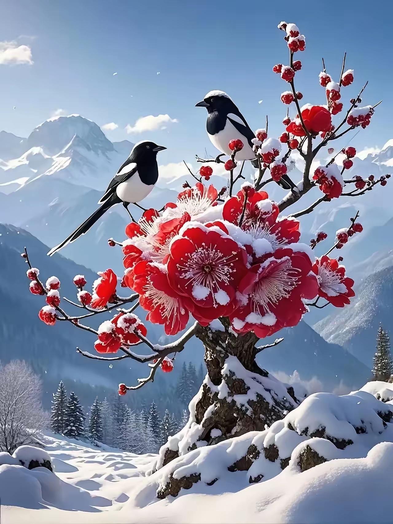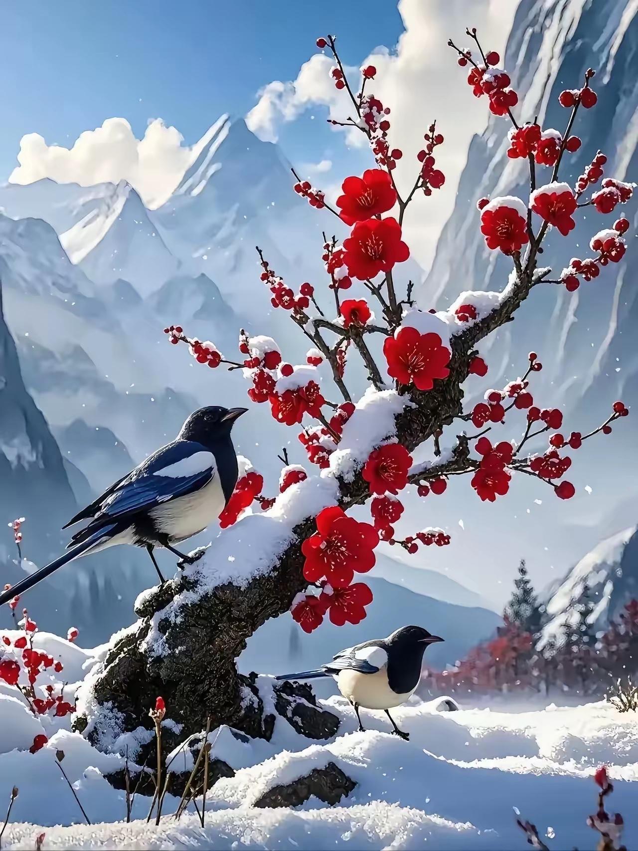 七律· 冬日吟咏 文/理想 冬日琼花漫舞飞,朔风瑟瑟穿枫林。 冰河波静鱼无语,翠柏枝摇鸟欲吟。 若觅荣华秋已去,如言佳丽客难寻。 念君最爱观冬景,鹊上梅稍唱美音。