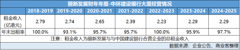由于有大租户存在,中国建设银行大厦的经营表现相对比较稳定。新冠疫情以来,香港经济环境发生多轮波动,大厦租金收入却一直稳定在2亿港元,出租率也未曾跌破过90%。