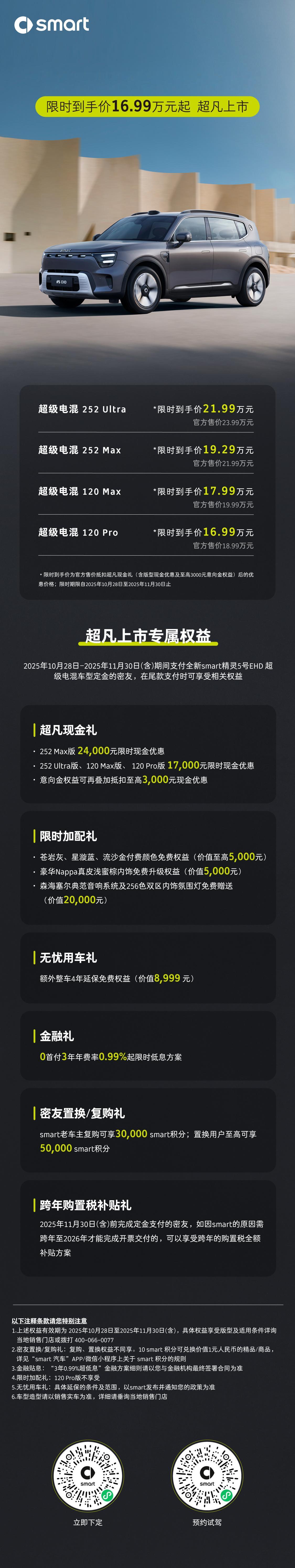 中德混血的超级电混够理想吗smart 5 EHD超级电混全国交付开始了~总结亮点:搭载雷神电混2.0技术,1615km综合续航+252km纯电里程,4.4L亏电油耗,大五座空间➕NAPPA真皮零重力座椅!价格16.99万起~具体权益大家可以看看图四!