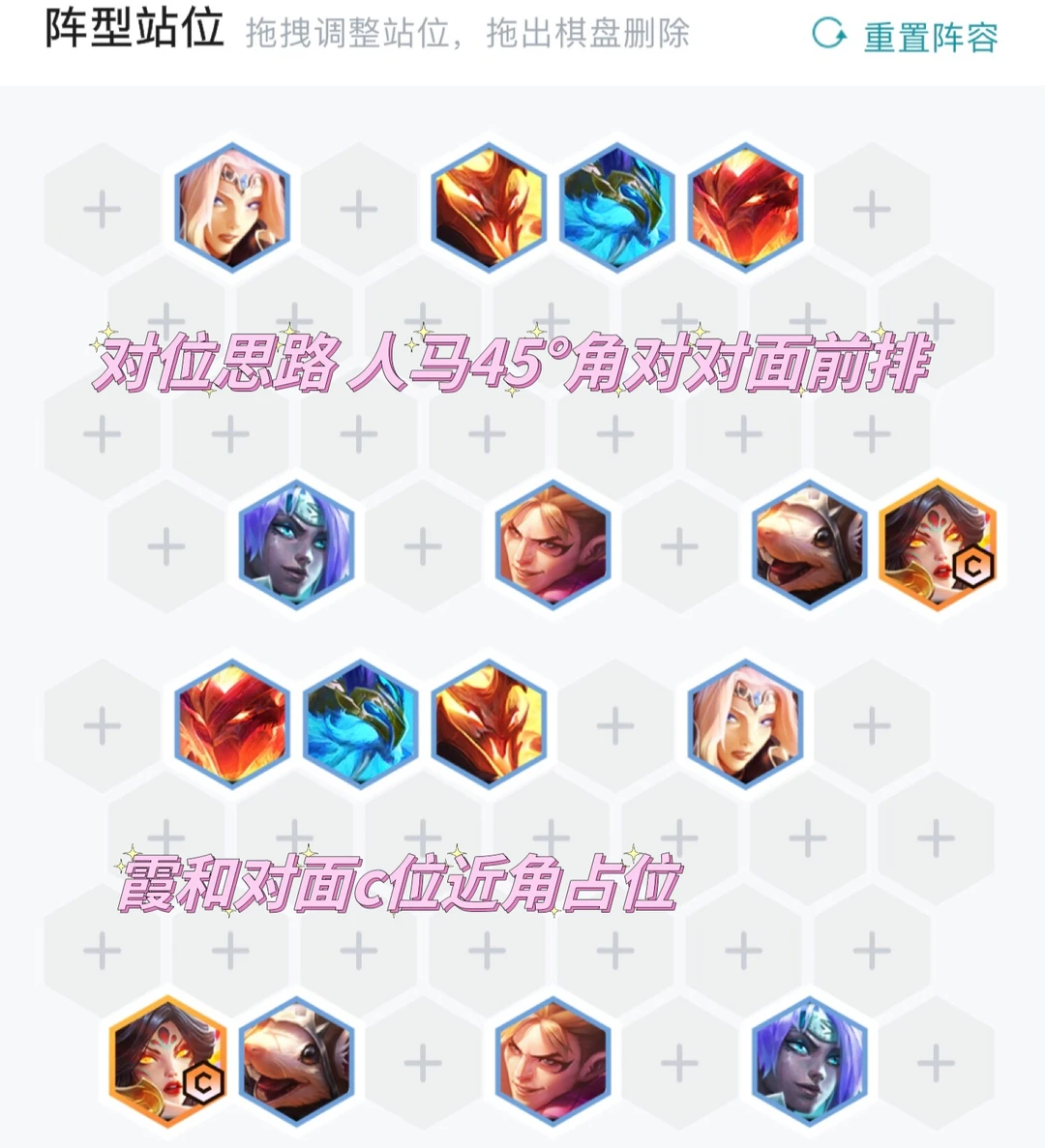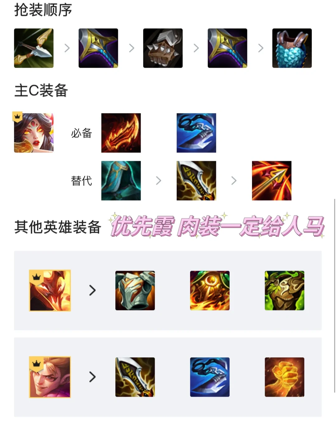 霞是阵容输出核心,一定先满足霞,男刀是副C(选秀和秘宝拿就行)。人马是坦度核心,虽然这套阵容没有标准的前排,但人马是最好的选择了。