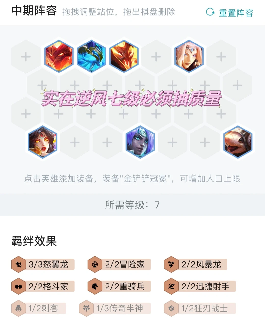 中期承接前期分别对应玉龙神龙尊者体系或者斗士冒险重骑体系,除了压力特别大的逆风局,一般都是直接上8搜牌,实在顶不住连败局就得在7人口抽质量了。