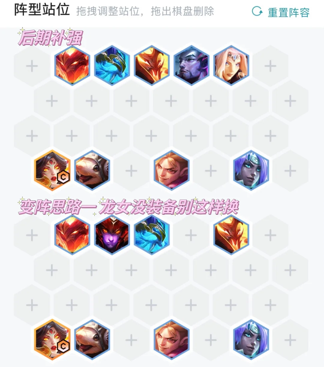 后期上限两条路,一是8人口追三星紫卡,二是上9找到亚索或者是龙女开6怒翼(一定要有龙女装备 要不别带龙女)。