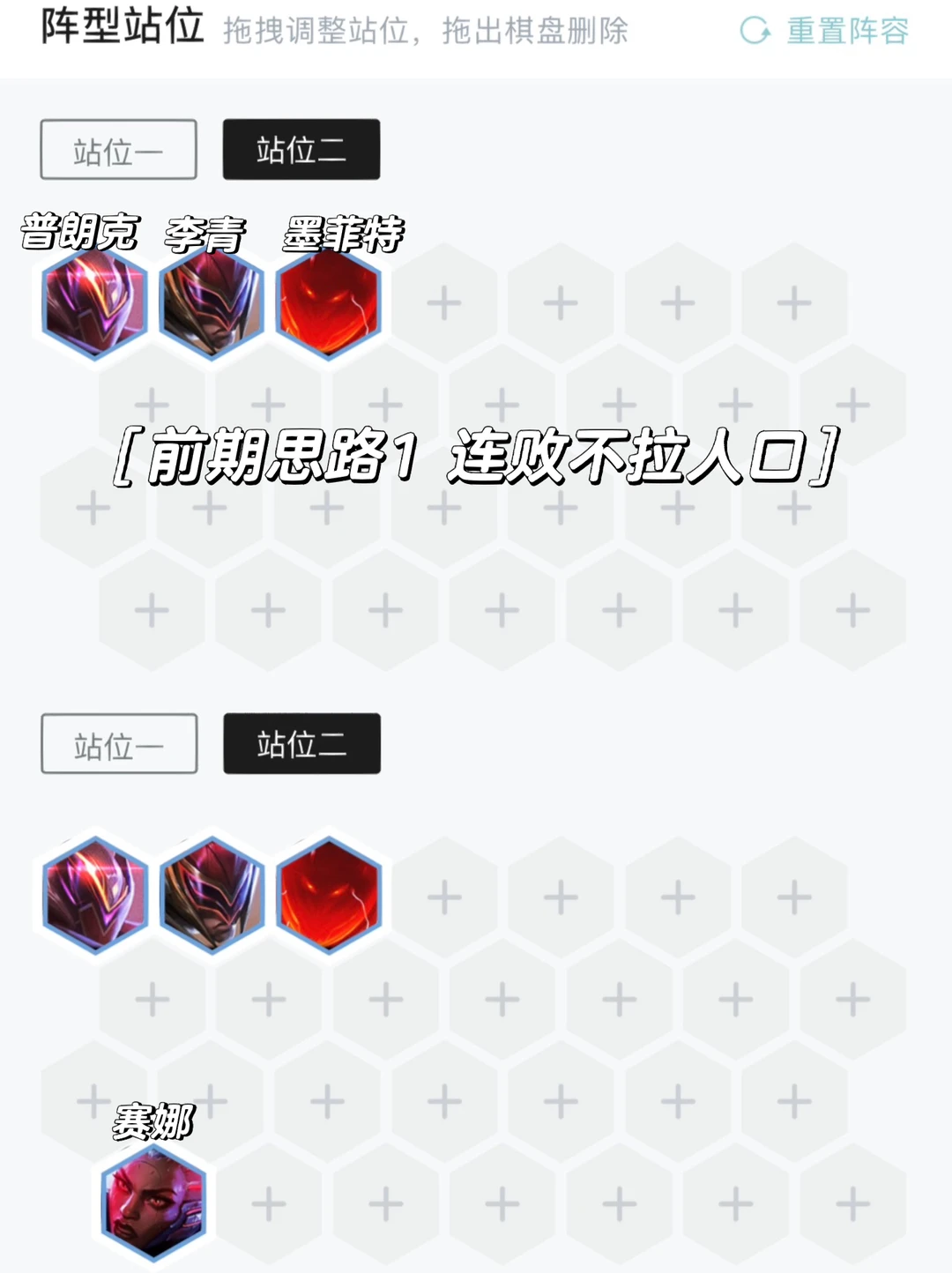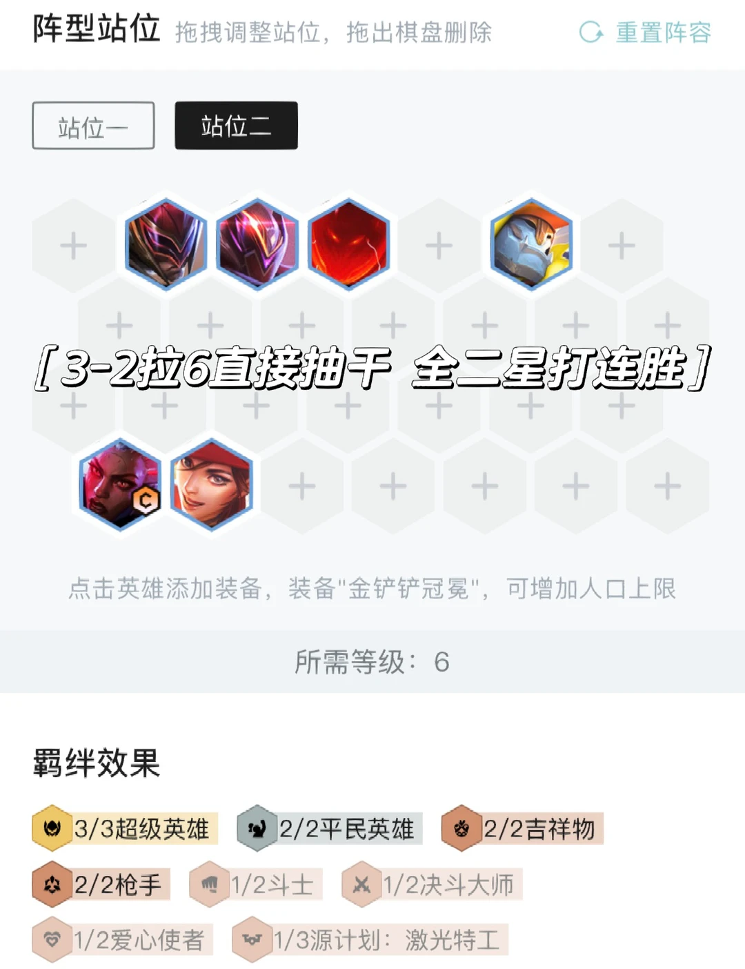 前期不拉人口,3-2直接拉6,抽到5个二星停手,抽不出就抽到没钱,一定要转连胜。第二波启动大概在3-5,保证全体二星,第三波启动大概在4-2或者4-5看经济情况吧。