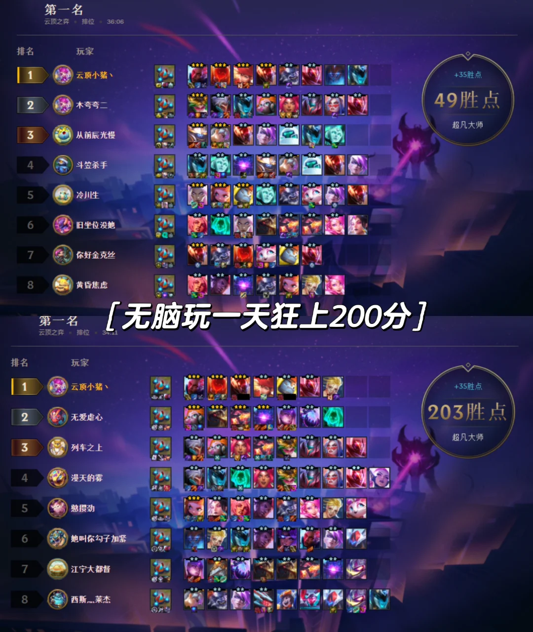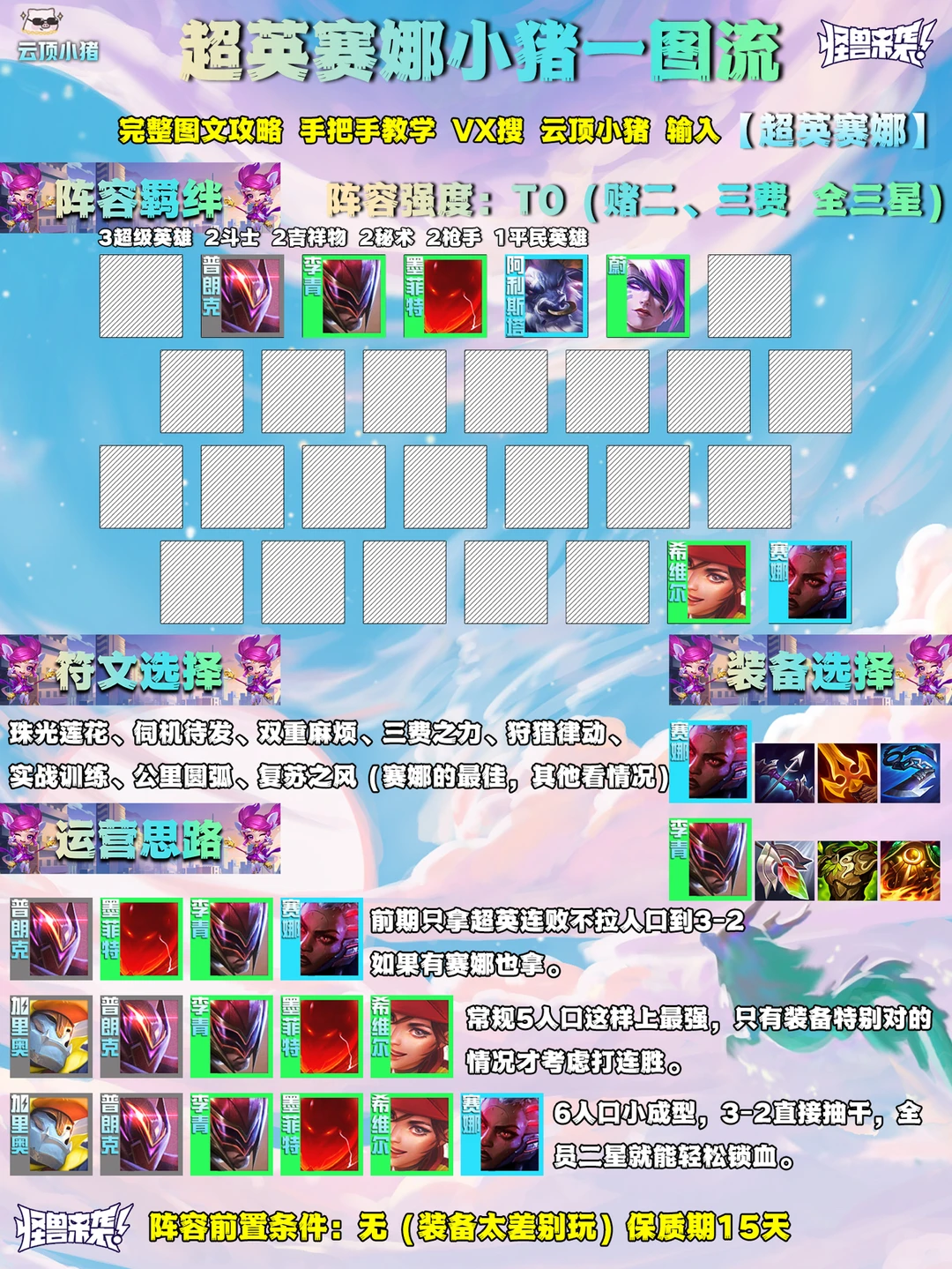[偷笑R]今天给大家推荐一套版本严重被低估的阵容,超英赛娜。这套阵容的强度真的有点超标,小猪从前天凌晨到昨天凌晨,抛开写攻略睡觉的时间,玩了不到半天的赛娜,直接上了快200分。