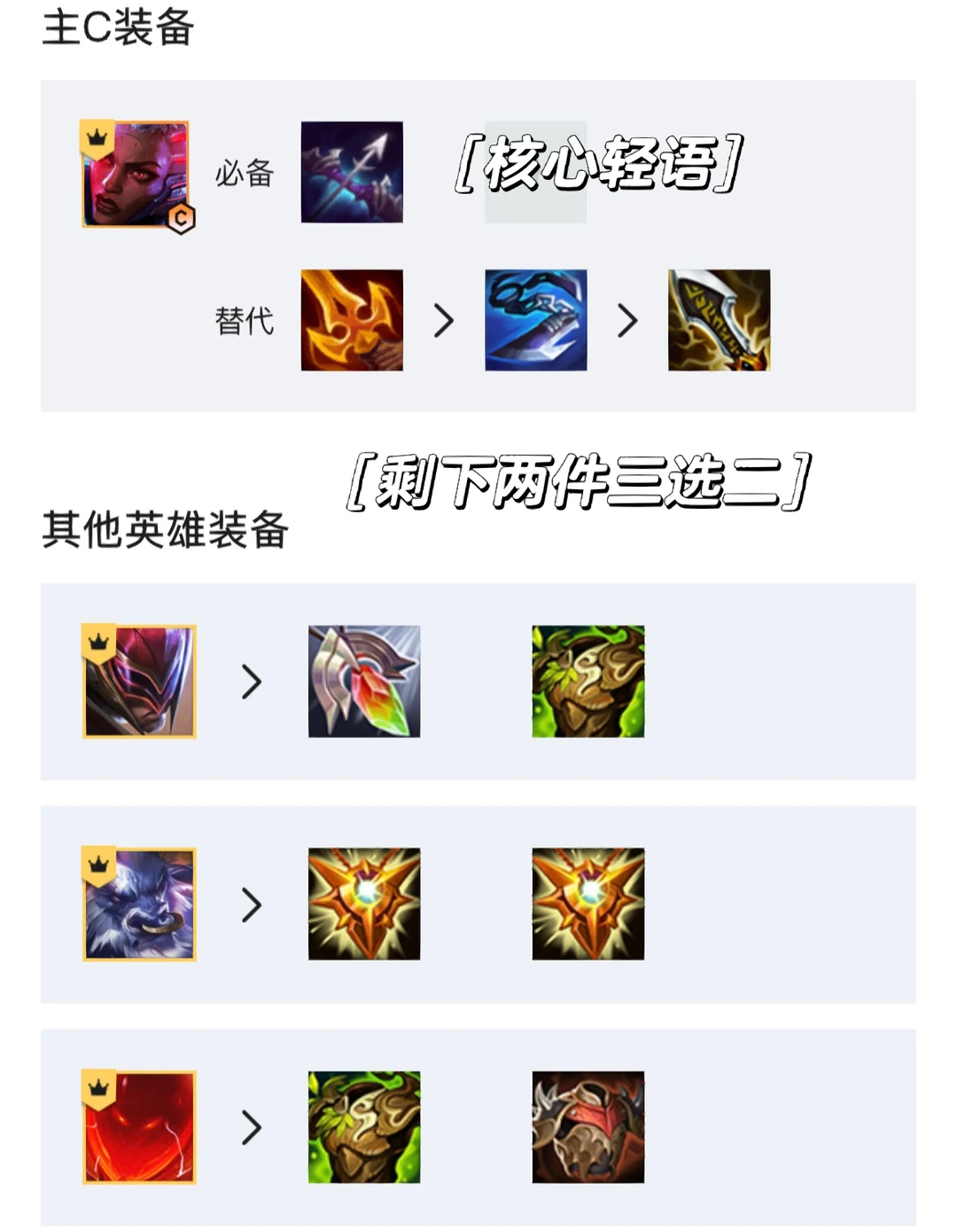 其他装备全部给前排,谁三星给谁就好,有大棒优先考虑做鸟盾,其他大棒装这个阵容消化不了。