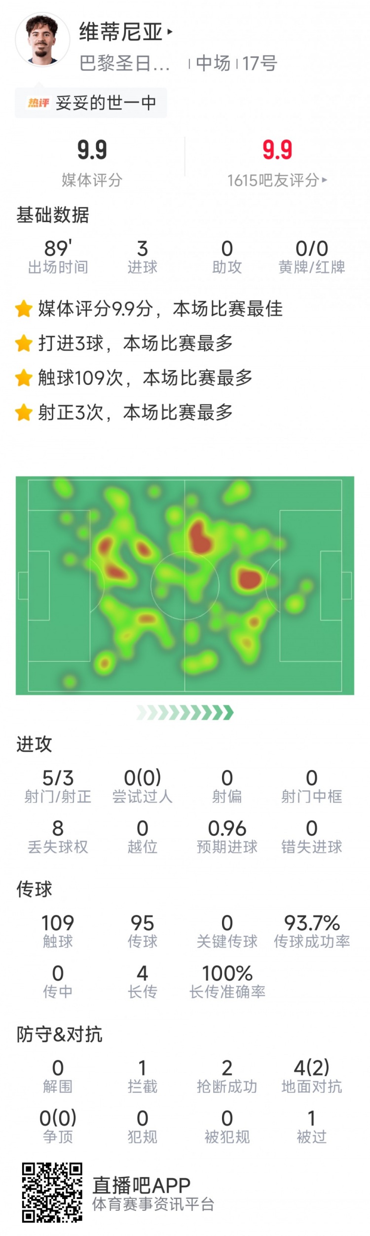 维蒂尼亚本场数据:上演帽子戏法,5射3正,2抢断,评分9.9分