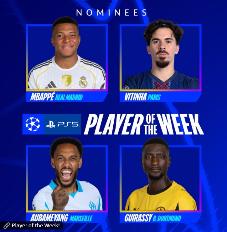 欧冠官方本轮最佳球员候选:姆巴佩、维蒂尼亚、吉拉西、奥巴梅扬