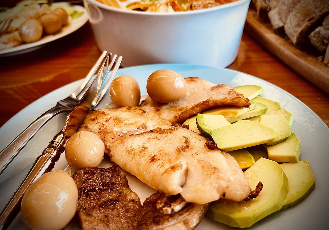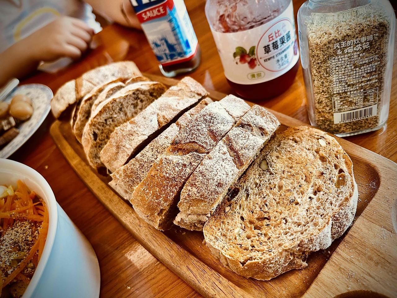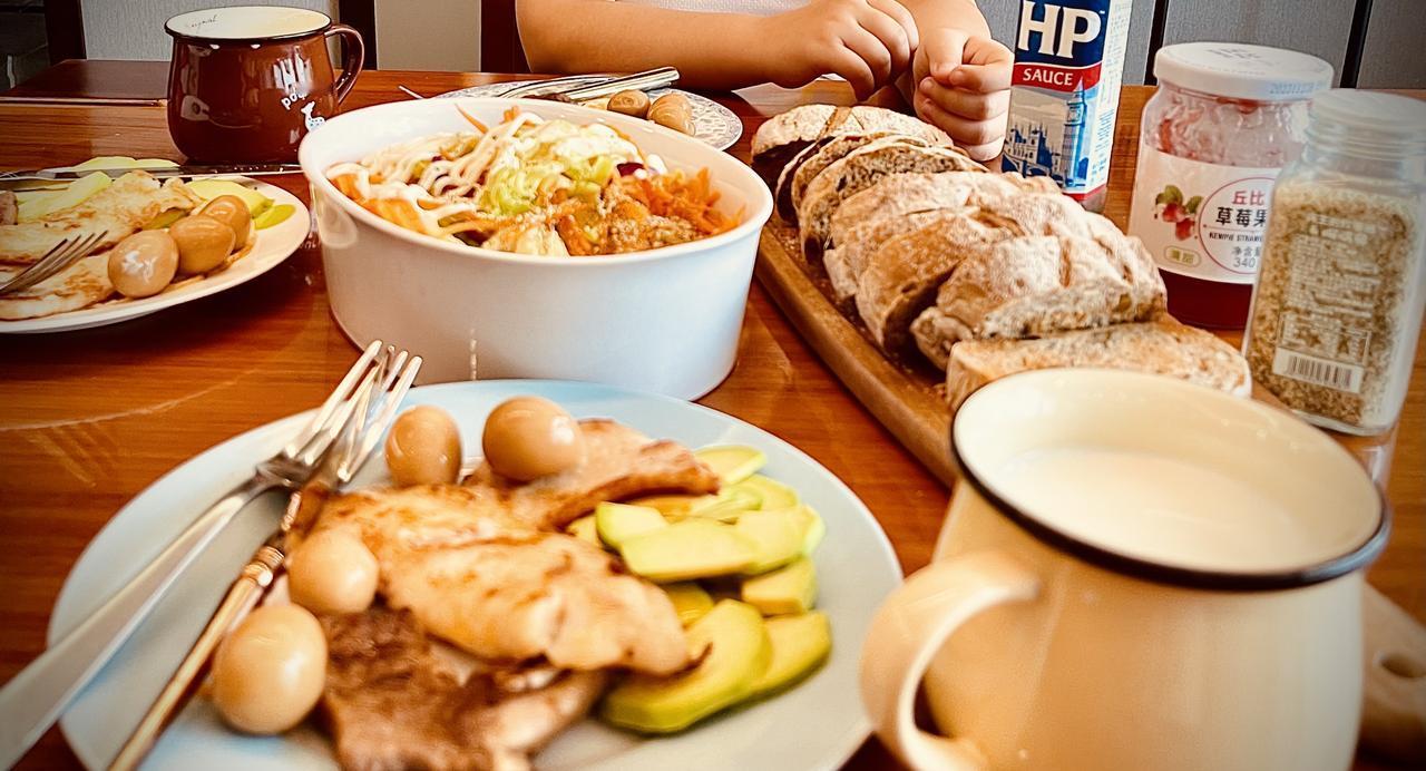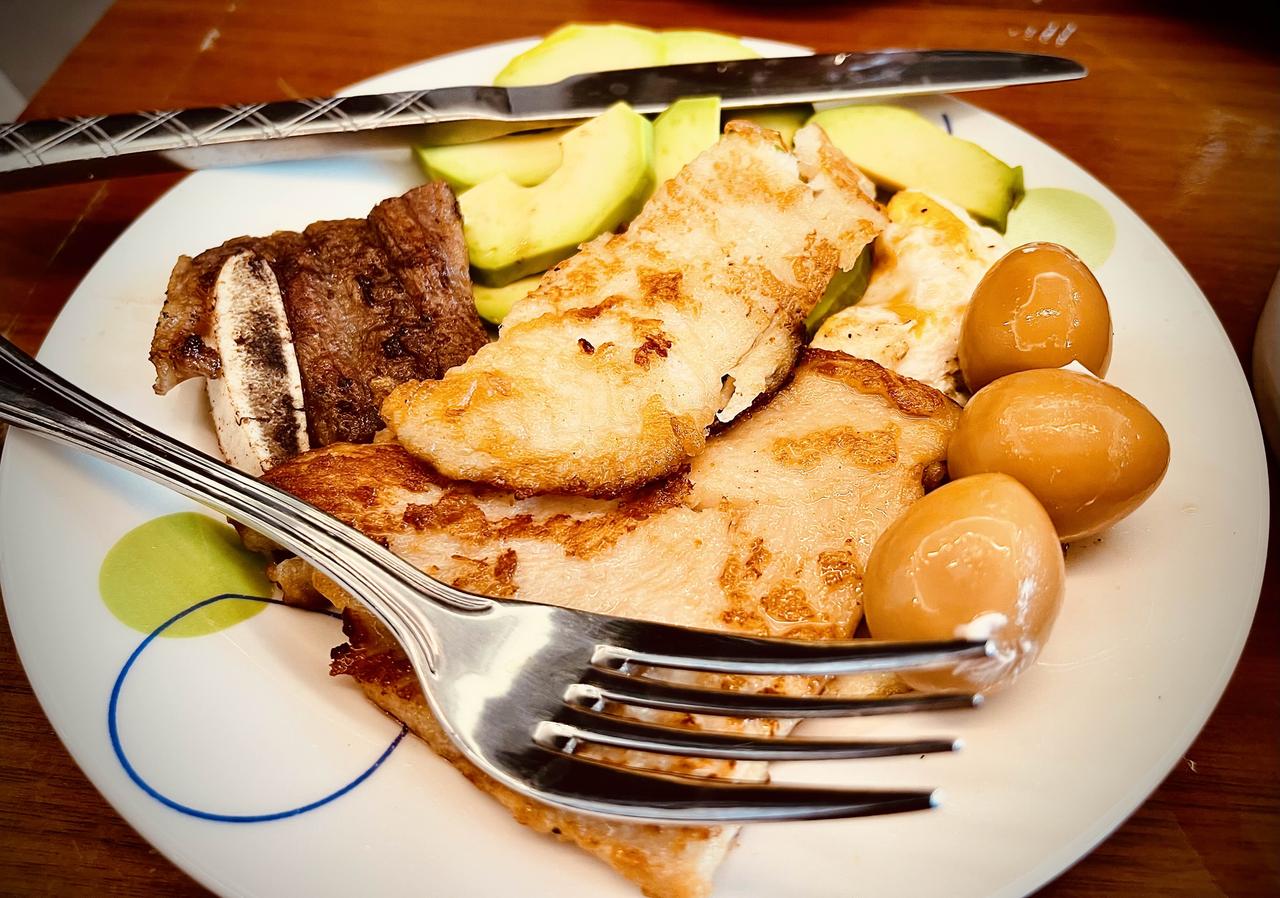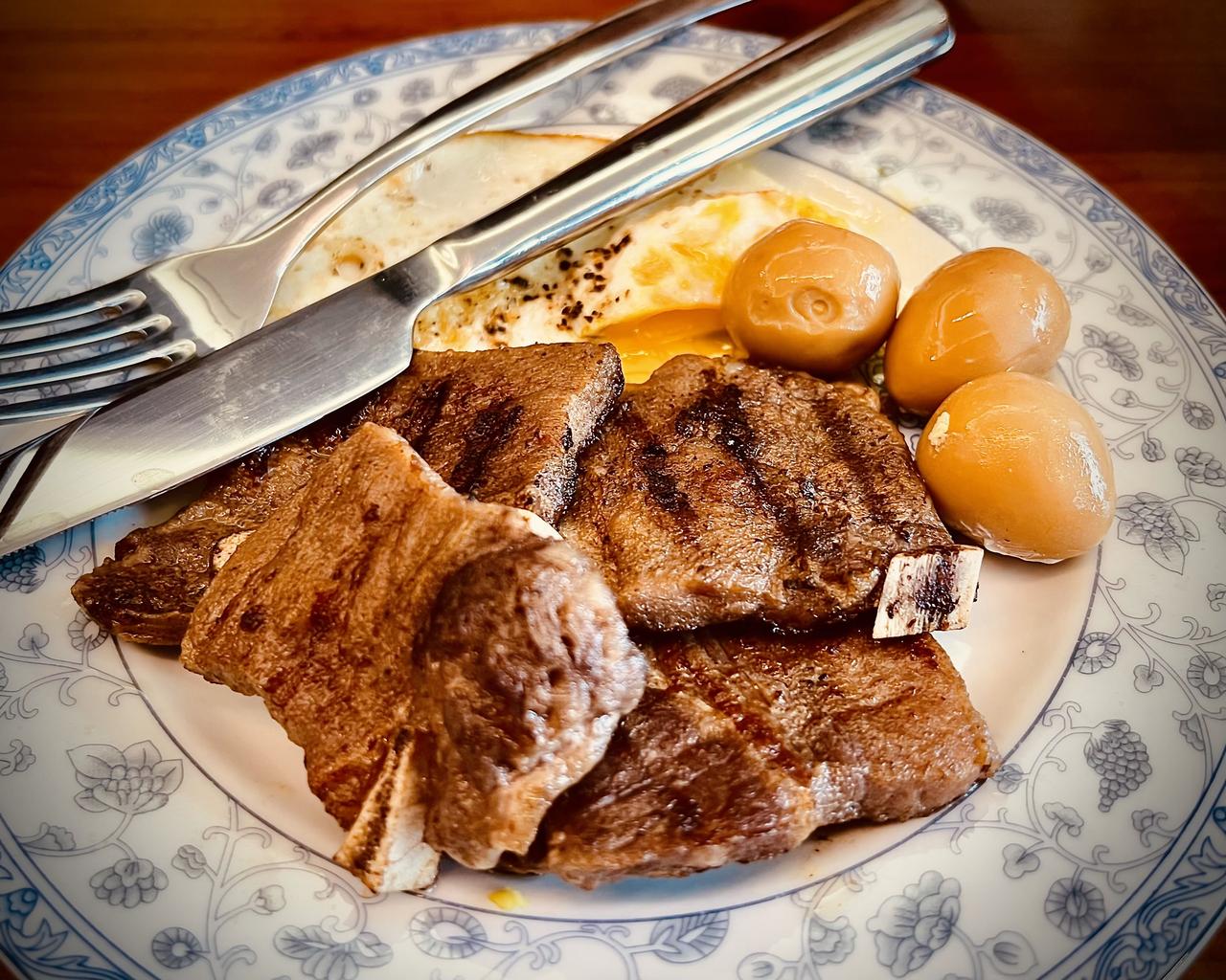 煎了几块牛仔骨,茶叶鹌鹑蛋,蔬菜沙拉配牛奶干巴面包。面包烤一下,酥脆才好吃。
