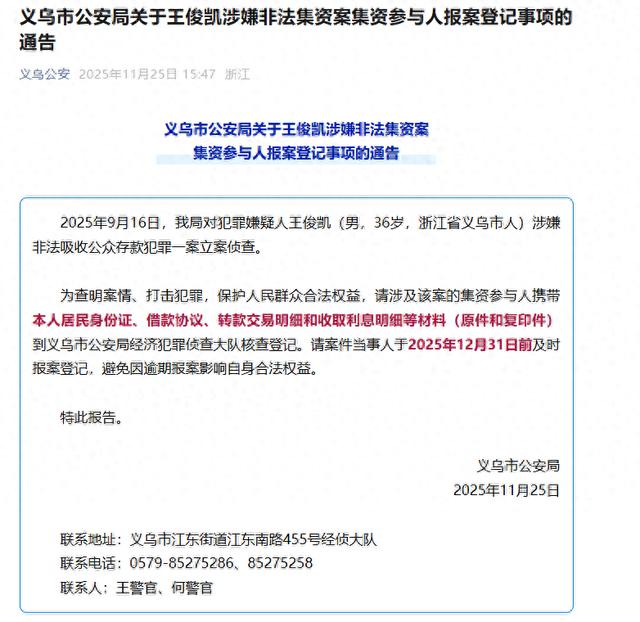 11月25日,义乌市公安局发布通告:2025年9月16日,我局对犯罪嫌疑人王俊凯(男,36岁,浙江省义乌市人)涉嫌非法吸收公众存款犯罪一案立案侦查。