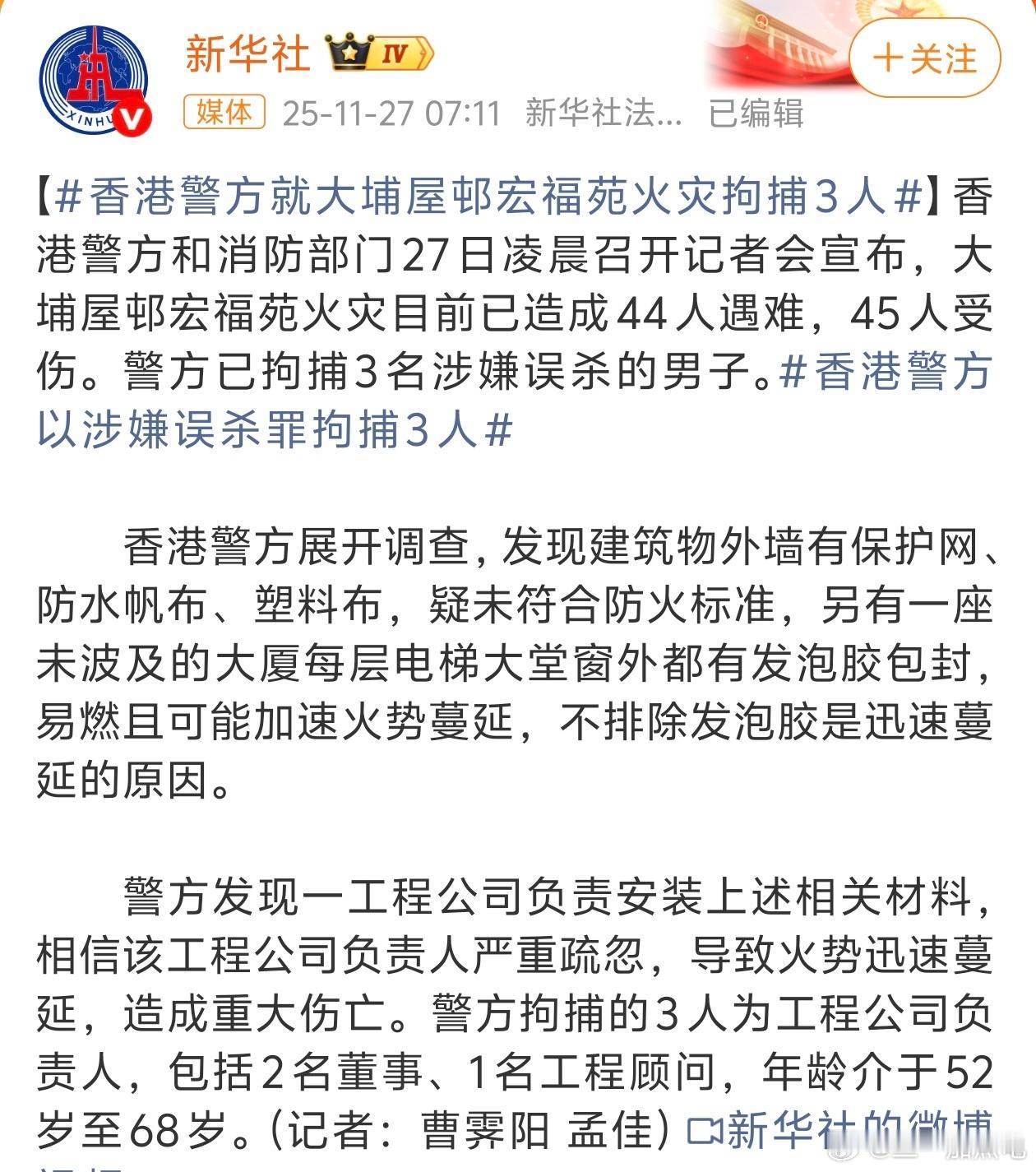 香港火灾已致44人遇难还有200多人失联的,唉我这两天就在香港,昨天吃宵夜的排档电视一直在新闻直播这事,不少路人经过的时候都会驻足看一眼新闻。已经抓了工程公司三个负责人了,这个算是妥妥的安全生产事故。其实我都很奇怪,香港这么发达的地区,还用竹竿去搭脚手架,内地都很难见到工地用竹竿了。一共8栋楼,1栋楼没事,4栋楼扑灭了,还有3栋烧着,希望不要有更多的人牺牲了。香港火灾救援预计持续至黄昏
