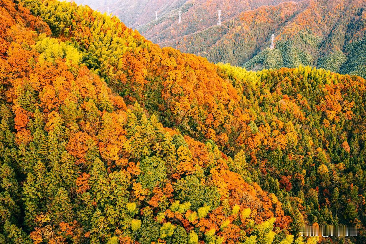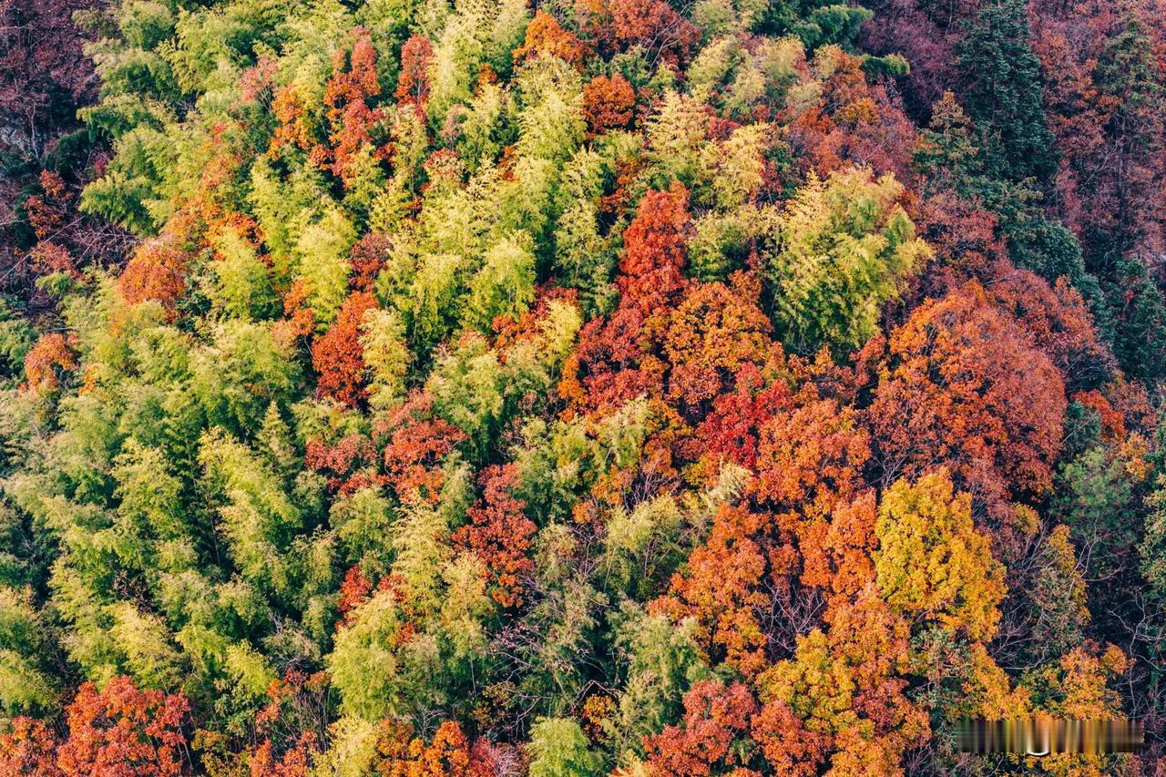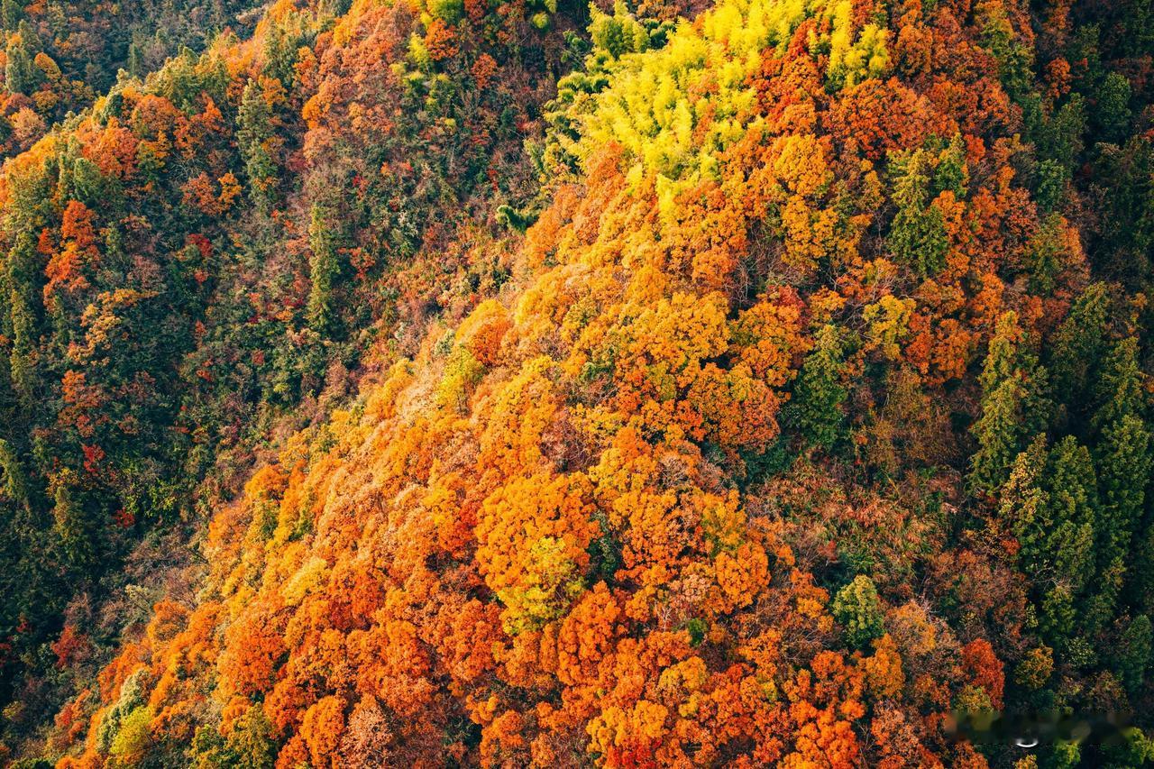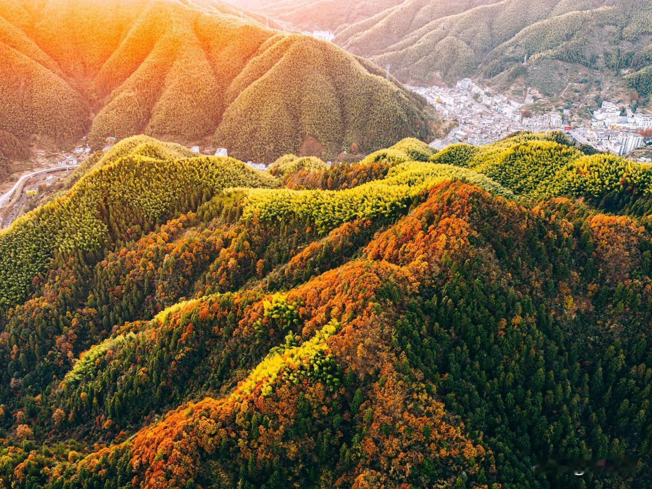 现在黄山最美的彩林竟然不在黄山景区里面,而是在黄山南大门外对着的山头。 黄山山上已无秋色,黄山几乎都是有松树为主,临近云谷寺的一段已经完全落叶。但没想到景区外的山头竟然如此艳丽。 航拍可见这座位于国道G205山深线与G3京台高速之间的山植被非常丰富,树林呈现五彩斑斓的色彩。有没人知道这座山叫什么名字?