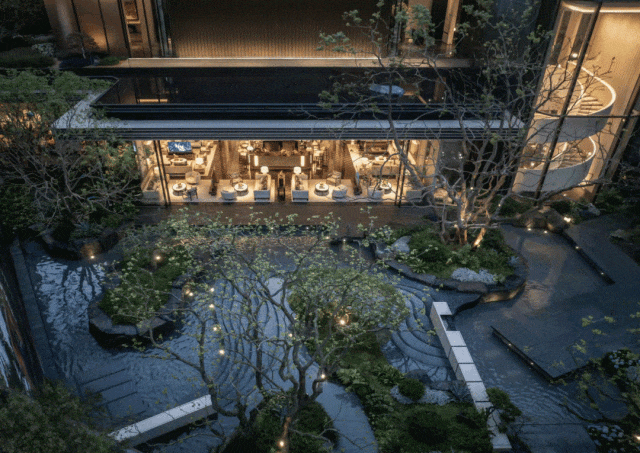 7号楼架空层以“睦邻空间”为定位,设置无界交融过厅、冥想区与花木小庭,在都市中营造一片自然绿洲;