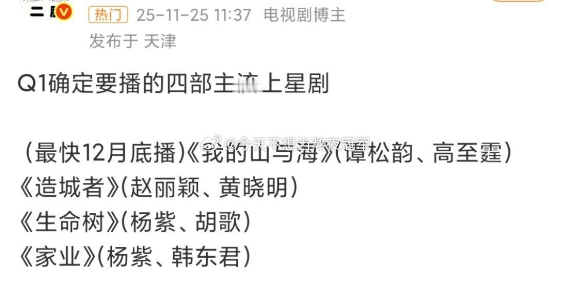 赵丽颖🐧《造城者》央一,杨紫🥝《生命树》央八预排明年1月中旬黄金档,看来势必要给新年档一个爆开