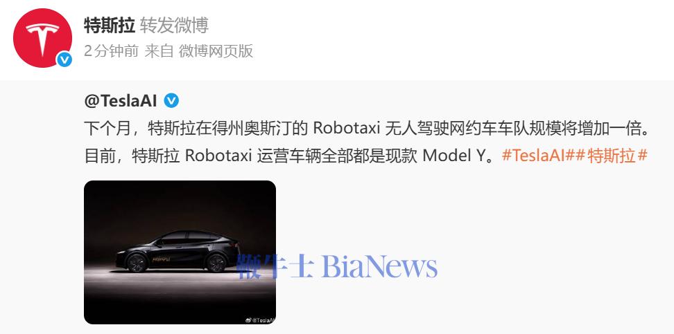 今日,特斯拉AI官方微博宣布,下个月,特斯拉在得州奥斯汀的Robotaxi无人驾驶网约车车队规模将增加一倍。
