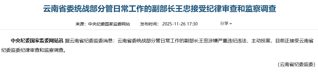 中央纪委国家监委网站讯据云南省纪委监委消息:云南省委统战部分管日常工作的副部长王忠涉嫌严重违纪违法,主动投案,目前正接受云南省纪委监委纪律审查和监察调查。