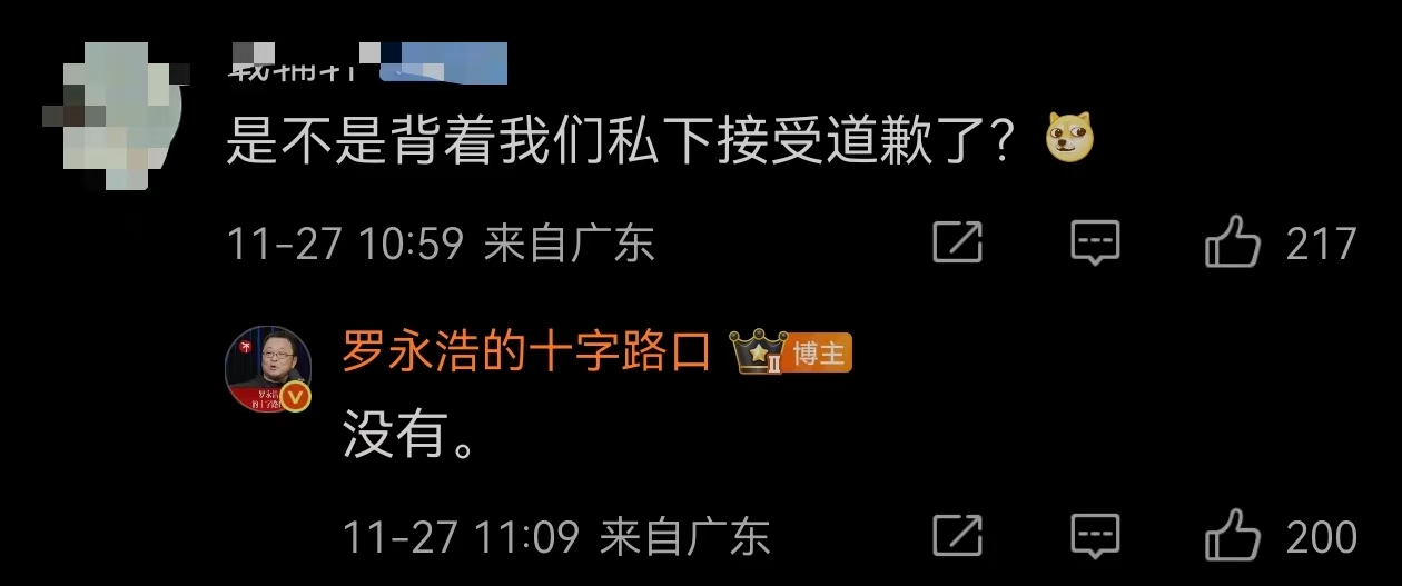 有网友询问是否已经私下接受道歉,罗永浩予以否认;