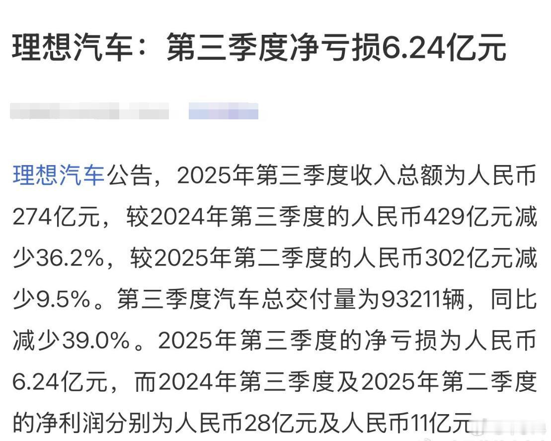 今年第三季度,理想汽车营收274亿元,同比减少36.2%,环比减少9.5%。第三季度毛利为45亿元,同比下降51.6%,环比下降26.3%。可能这并不是理想自己的问题,而是对手们太强了,太卷了。客观来说,理想确实吃到了豪华SUV的第一块蛋糕,但是不可能他自己全部吃下,随着鸿蒙智行、小米、零跑、吉利系等等车企的跟进,中大型豪华SUV的竞争越来越激烈了,大量新车型涌入这条赛道,也就稀释了理想的产品力。几年前,想买个差不多的中大型SUV,理想基本是唯一选择。但现在新车遍地开花,随便挑出一个来都比理想更好。接下来,理想要面对的问题可能更棘手了…..理想汽车营收下滑36%理想汽车第三季度净亏损6.24亿