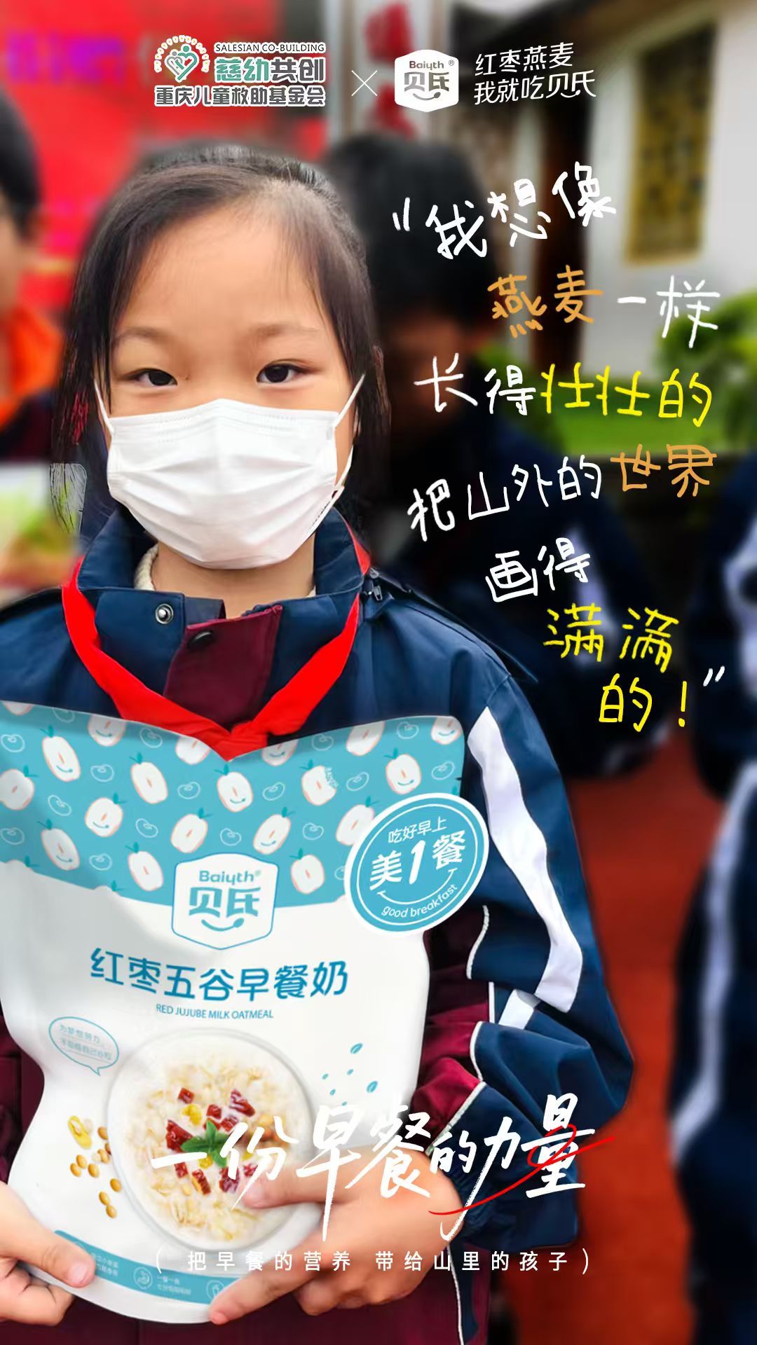 一份早餐的力量把早餐的营养带给山里的孩子 简陋校舍里,贝氏燕麦热粥飘香~微光汇聚,让山区朝阳与城市霓虹同样灿烂~