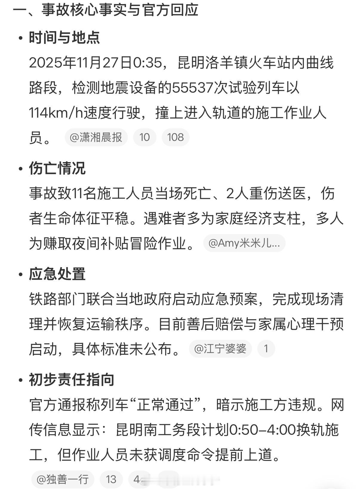 昆明一火车站试验列车撞人致11死 没想到啊!原来是施工人员不指挥导致的,这不纯纯
