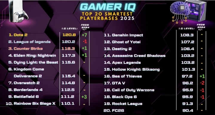 其中按游戏的平均智商排名如下,Dota第一,LOL屈居第二,GTA倒数,至于EA的足球游戏FC26直接成为倒数第一。