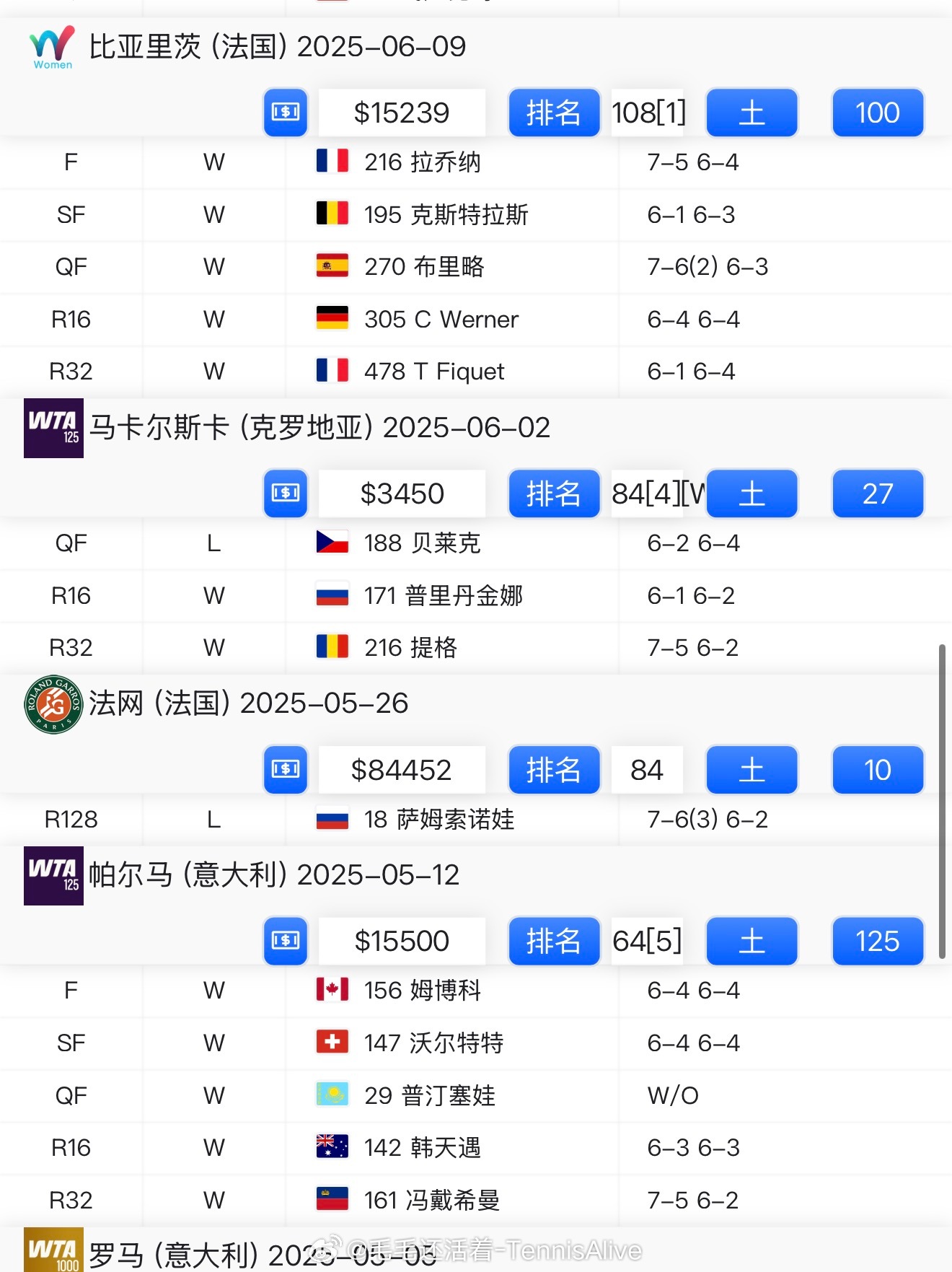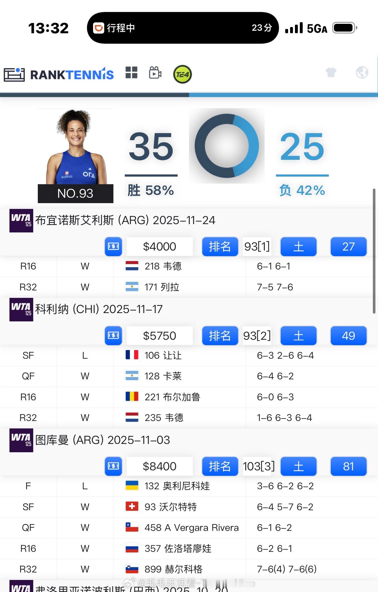 【网坛奇女子-125K女王谢里芙】谢里芙2025年巡回赛正赛战绩1胜14负。(赢的孙璐璐)其余的34胜全部参加的是100k和125k比赛。全年参加了13站125K、3站100K比赛。(全红土)但是今年125K的战绩也没那么好。拿到两站100K冠军,125K一冠一亚。美网后一直在参加红土125k。(怎么有这么多红土125k?)目前排名93位……