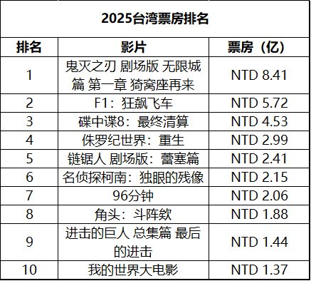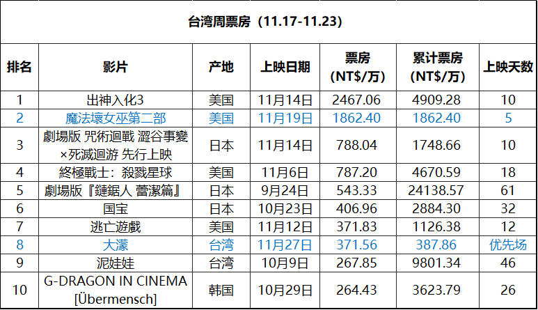 2025年第47周台湾票房 :1.《惊天魔盗团3》蝉联冠军,《魔法坏女巫2》开画成绩一般;2.《国宝》累计票房破3000万;3.《大濛》凭借口碑场上榜。(单位:新台币 数据:台湾电影及视听文化中心)
