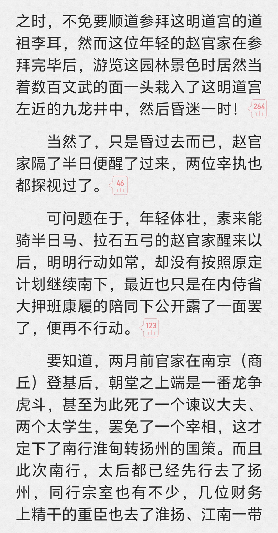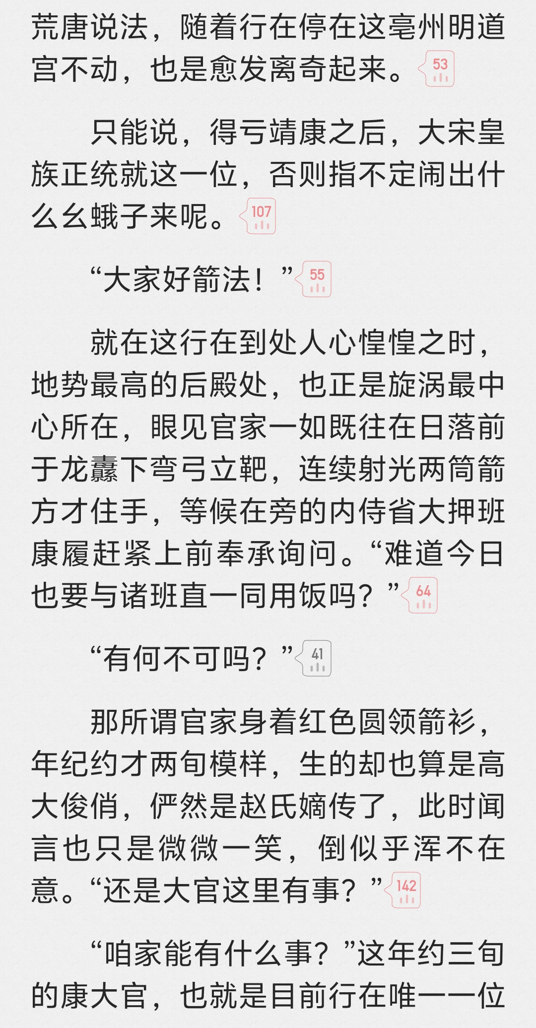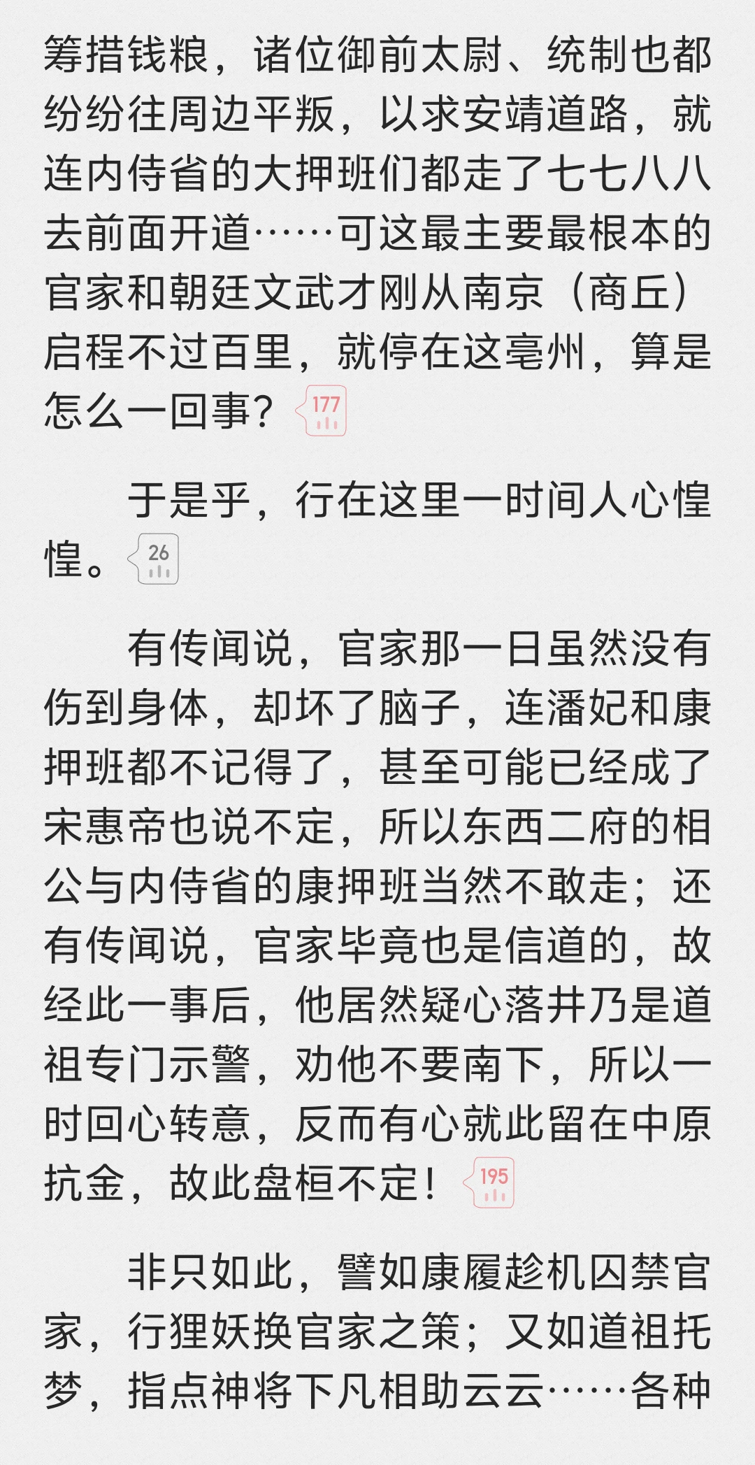 第八章的一刀杀康履,更是心惊与对于作者文字残忍的惊艳欣喜,生出赵九一般的自己距离这个时代还很远。这就是让读者有身临其境之感,更是将当时南宋朝廷流 亡的历史感写出。