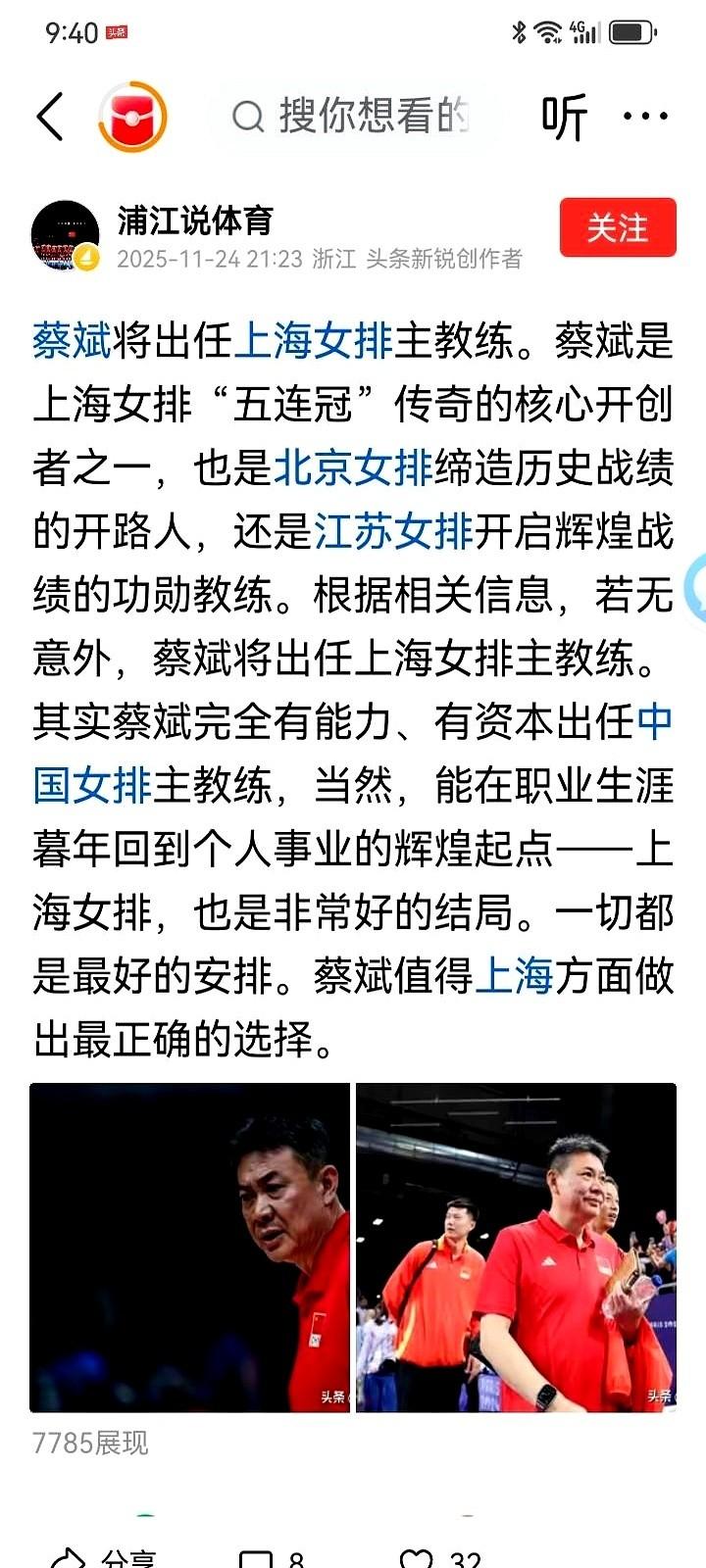 蔡斌回上海这事儿,说白了,就是牌桌上有人直接扔了一把王炸。 这棋下得,真叫一个“司马昭之心”。 你看现在的排超格局,天津什么情况?进四强都得烧高香。山东呢?老样子,关键时刻手软脚软。福建进步是快,但想跟豪门掰手腕,底子还是薄了点。 最有意思的是卫冕冠军江苏,就认准了“全苏班”,有种“我命由我不由天”的执拗。我佩服这种骨气,但现实是,人家都在开航母,你非要划小舢板。 这时候,上海队站出来了。 人家不差钱,就差个能把钱花出响儿、能镇得住场子的人。 蔡斌是谁?一个兜里揣着一肚子战术,也憋着一肚子气的主儿。他在国家队这几年,听了多少风言风语?他比谁都想证明自己。 这俩一拍即合,简直了。 一个有钱有平台,一个有能力有野心。 二十五年啊,整整四分之一个世纪,上海女排离那个冠军有多远?远到快忘了是啥滋味了。 蔡指导这次要是真能带着几个强力外援,把冠军奖杯捧回上海滩…… 那以后,谁还敢多说半个字? 所有的质疑,所有的风凉话,都会被这一个金灿灿的冠军,堵得严严实实。 这才是最狠的“打脸”。