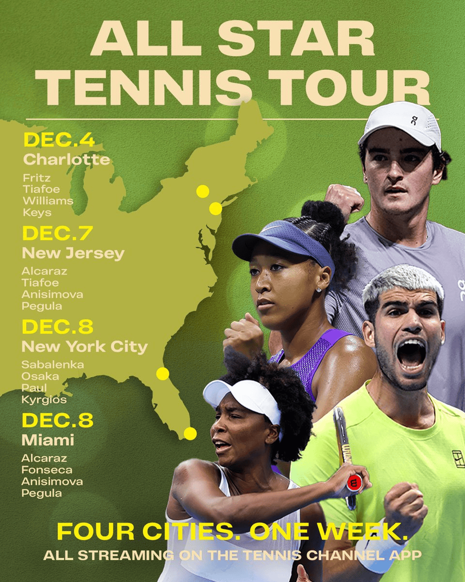 这项运动的最大牌球星将在夏洛特、新泽西、纽约市和迈阿密四城的球场上亮相。