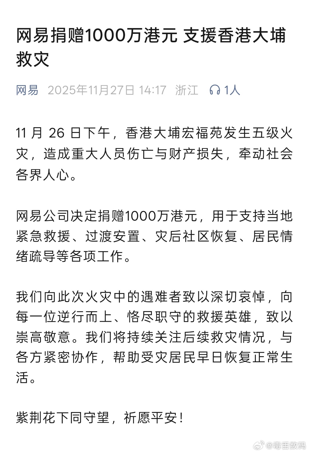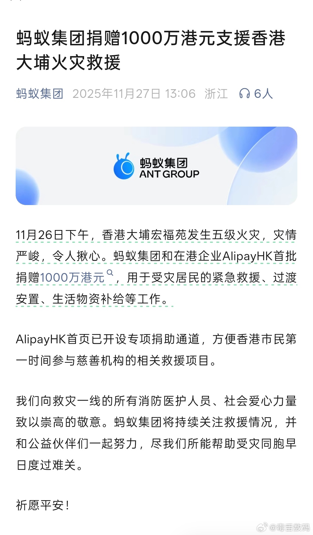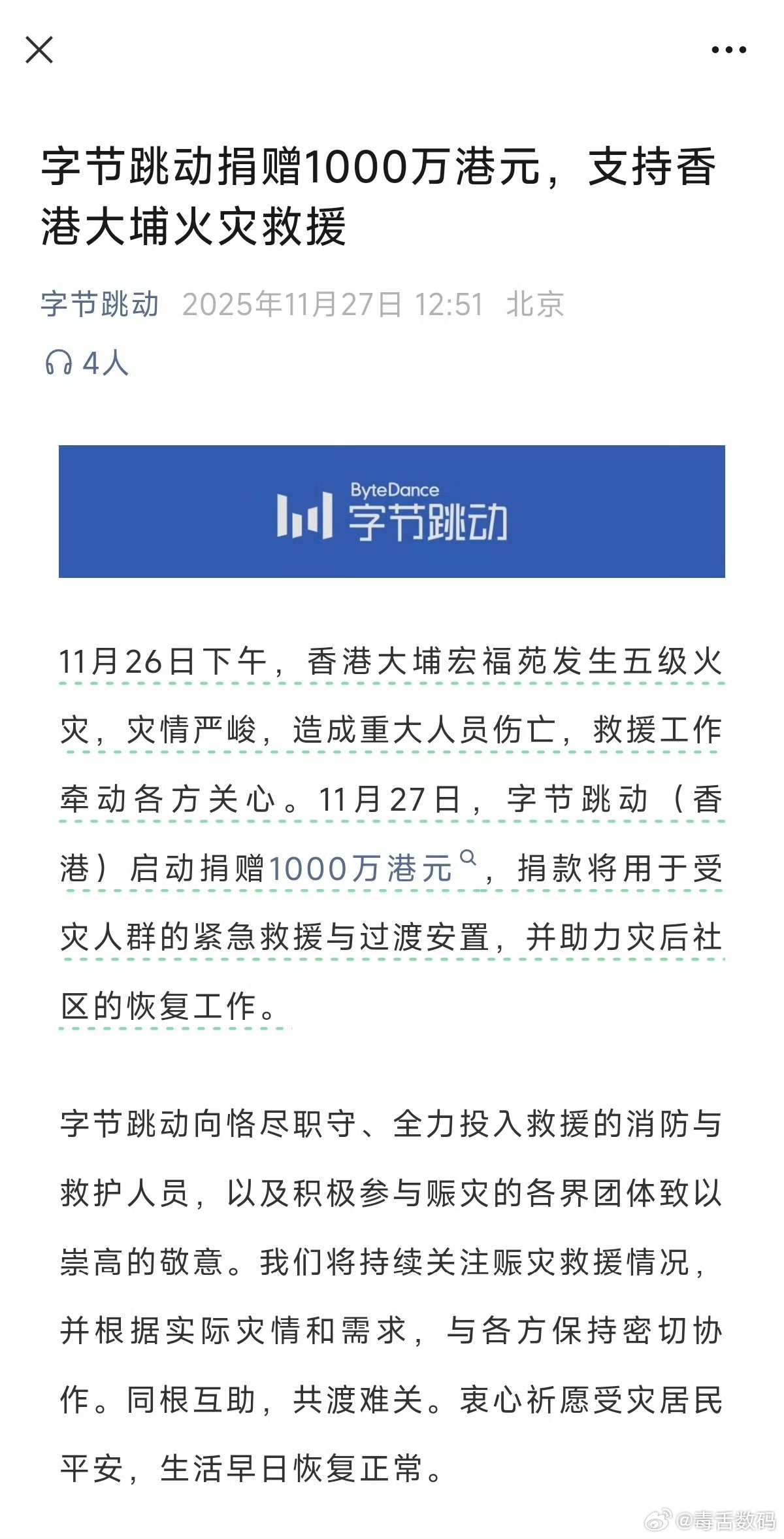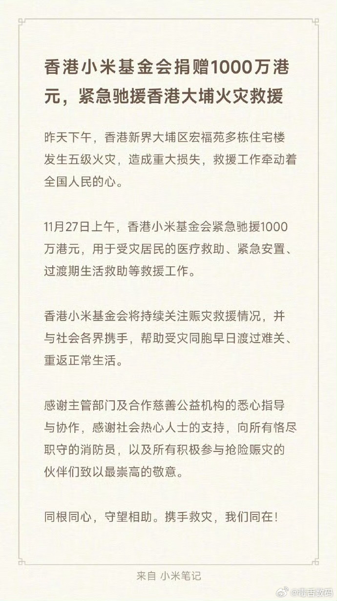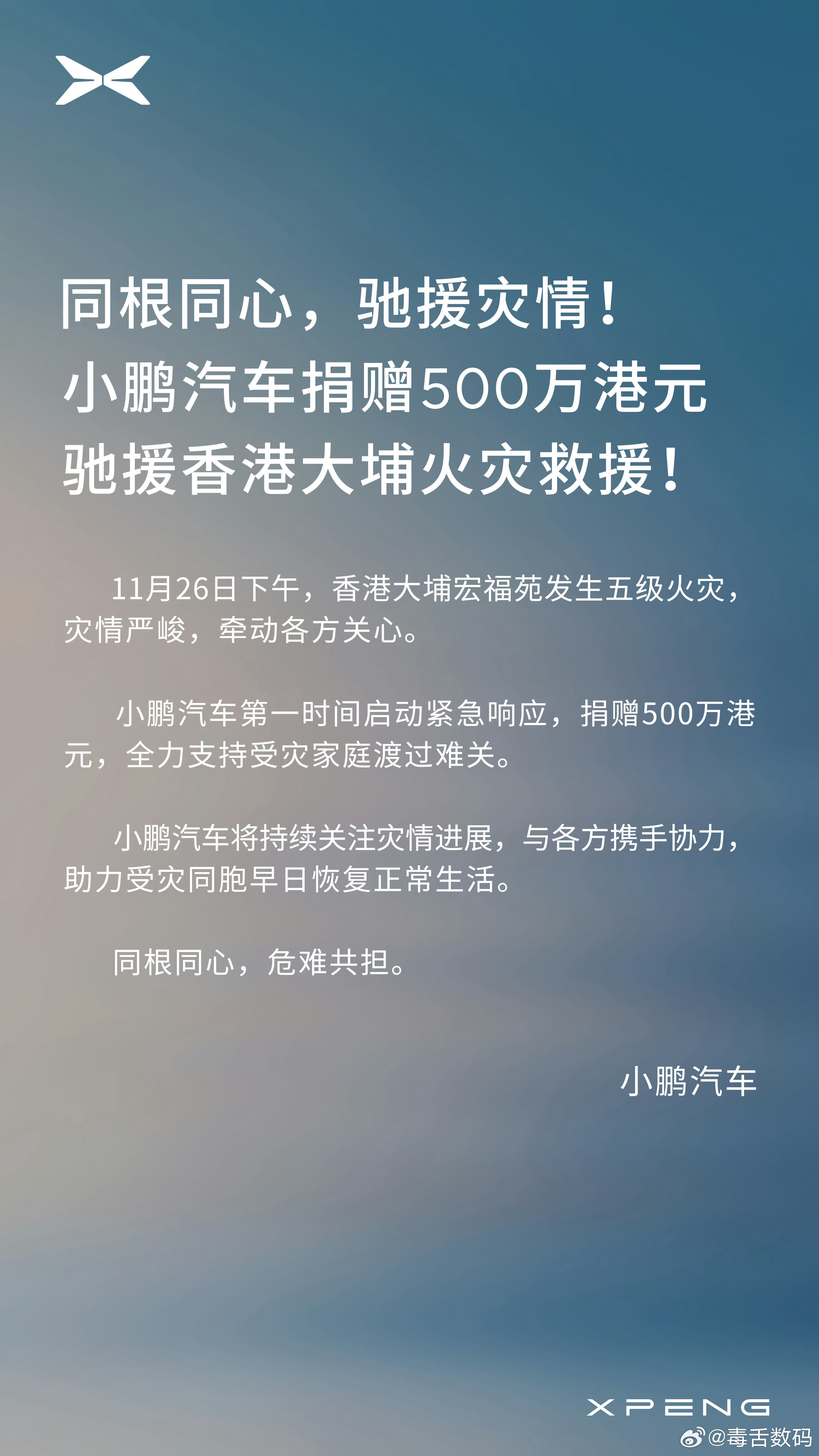 腾讯、小米、小鹏汽车、比亚迪、字节跳动、阿里巴巴、蚂蚁集团、网易、安踏等多家企业为香港火灾捐物捐款,为他们点赞 多家车企为香港火灾捐款