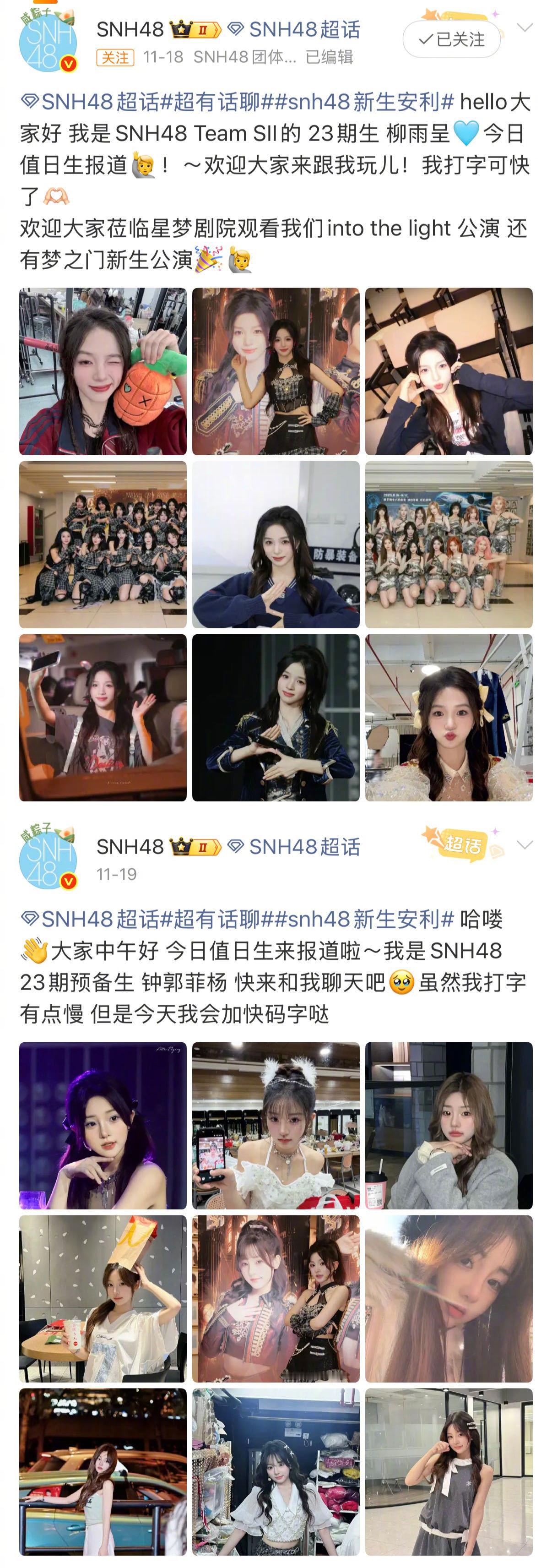 超有话聊SNH48给内娱上新了 SNH48 作为大型青春女团GROUP,微博独家新生值班栏目已经到第五季啦,这次有18位全新预备生现身,用花式自我介绍点燃寒冬~单人专属日+创意互动模式,带你近距离感受新生代魅力~快来看看有没有你pick的那个~SNH48新人安利
